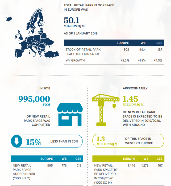 Загальний обсяг торговельних площ рітейл-парків у Західній Європі станом на 1 січня 2019 року склав 44,4 млн. кв. м, причому Німеччина, Великобританія і Франція залишаються найбільшими ринками у регіоні, на які припадає понад 74% від загального показника. В цілому, очікується, що в 2019-2020 рр. нова пропозиція складе 1,3 млн кв. м, що на 21% менше, ніж у 2018-2019 рр.