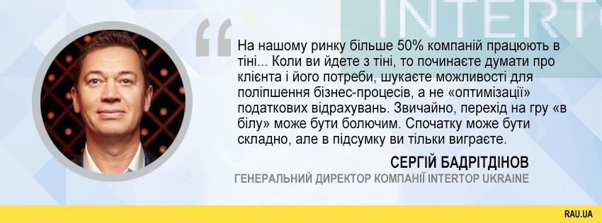 На нашому ринку більше 50% компаній працюють в тіні… Коли ви йдете з тіні, то починаєте думати про клієнта і його потреби, шукаєте можливості для поліпшення бізнес-процесів, а не «оптимізації» податкових відрахувань. Звичайно, перехід на гру «в білу» може бути болючим. Спочатку може бути складно, але в підсумку ви тільки виграєте.