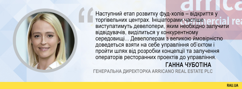 Наступний етап розвитку фуд-холів – відкриття у торгівельних центрах. Ініціаторами частіше виступають девелопери, яким необхідно залучити відвідувачів, виділиться у конкурентному середовищі… Девелоперам з великою ймовірністю доведеться взяти на себе управління об’єктом і пройти шлях від розробки концепції та залучення операторів ресторанних проектів до управління.