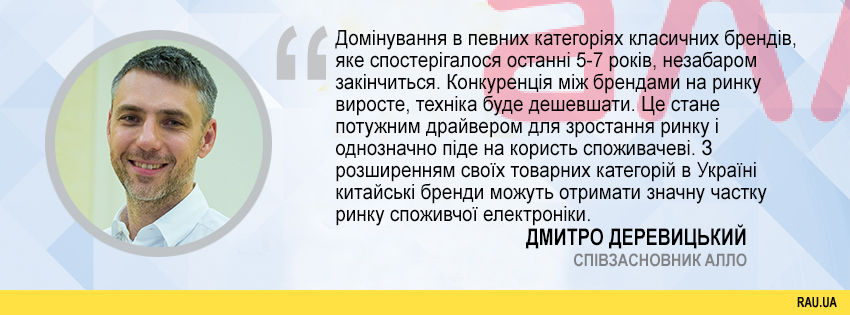 Домінування в певних категоріях класичних брендів, яке спостерігалося останні 5-7 років, незабаром закінчиться. Конкуренція між брендами на ринку виросте, техніка буде дешевшати. Це стане потужним драйвером для зростання ринку і однозначно піде на користь споживачеві. З розширенням своїх товарних категорій в Україні китайські бренди можуть отримати значну частку ринку споживчої електроніки.