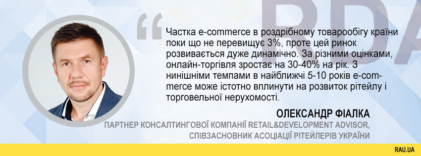 Частка e-commerce в роздрібному товарообігу країни поки що не перевищує 3%, проте цей ринок розвивається дуже динамічно. За різними оцінками, онлайн-торгівля зростає на 30-40% на рік. На ринок виходять великі міжнародні гравці, які активізують розвиток галузі. З нинішніми темпами зростання в найближчі 5-10 років e-commerce може істотно вплинути на розвиток рітейлу і торговельної нерухомості.