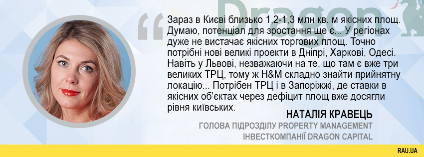 Зараз в Києві близько 1,2-1,3 млн кв. м якісних площ. Думаю, потенціал для зростання ще є. У регіонах дуже не вистачає якісних торгових площ. Точно потрібні нові великі проекти в Дніпрі, Харкові, Одесі. Навіть у Львові, незважаючи на те, що там є вже три великих ТРЦ, тому ж H&M складно знайти прийнятну локацію… Потрібен ТРЦ і в Запоріжжі, де ставки в якісних об’єктах через дефіцит площ вже досягли рівня київських.
