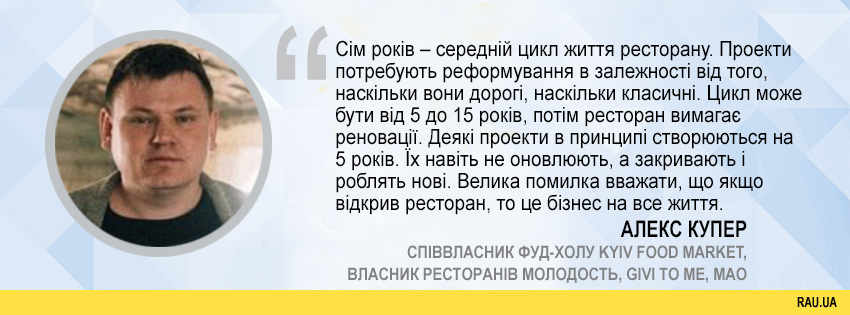 Сім років – середній цикл життя ресторану. Проекти потребують реформування в залежності від того, наскільки вони дорогі, наскільки класичні. Цикл може бути від 5 до 15 років, потім ресторан вимагає реновації. Деякі проекти в принципі створюються на 5 років. Їх навіть не оновлюють, а закривають і роблять нові. Велика помилка вважати, що якщо відкрив ресторан, то це бізнес на все життя.