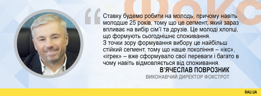Ставку будемо робити на молодь, причому навіть молодше 25 років, тому що це сегмент, який зараз впливає на вибір сім’ї та друзів. Це молоді хлопці, що формують сьогоднішнє споживання. З точки зору формування вибору це найбільш стійкий сегмент, тому що наше покоління – «ікс», «ігрек» – вже сформувало свої переваги і багато в чому навіть відмовляється від споживання.