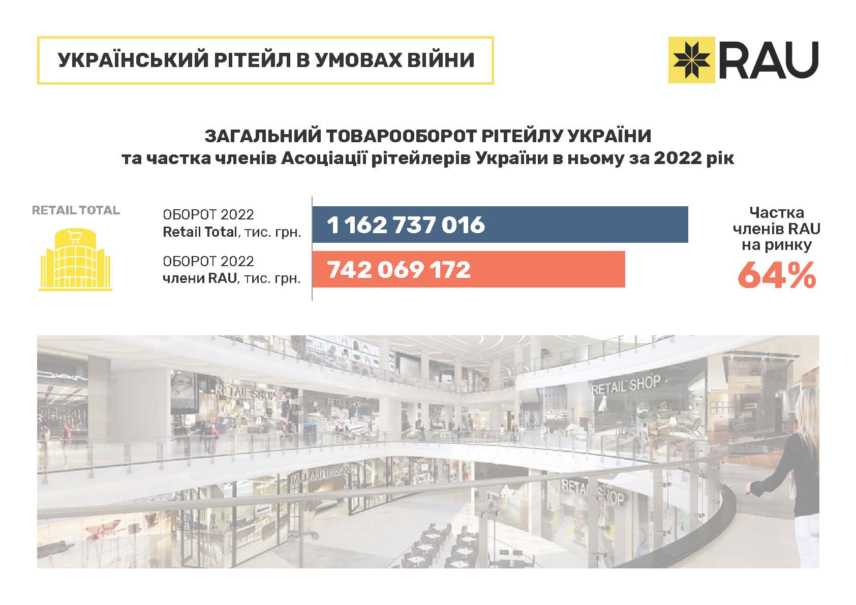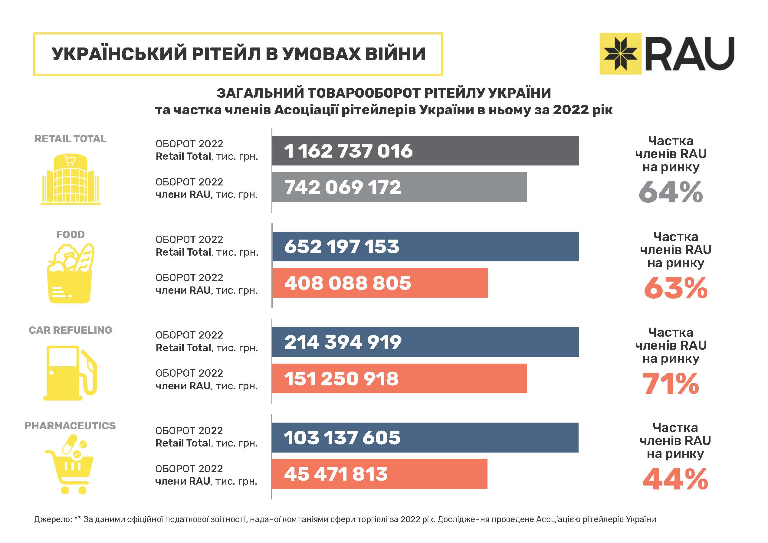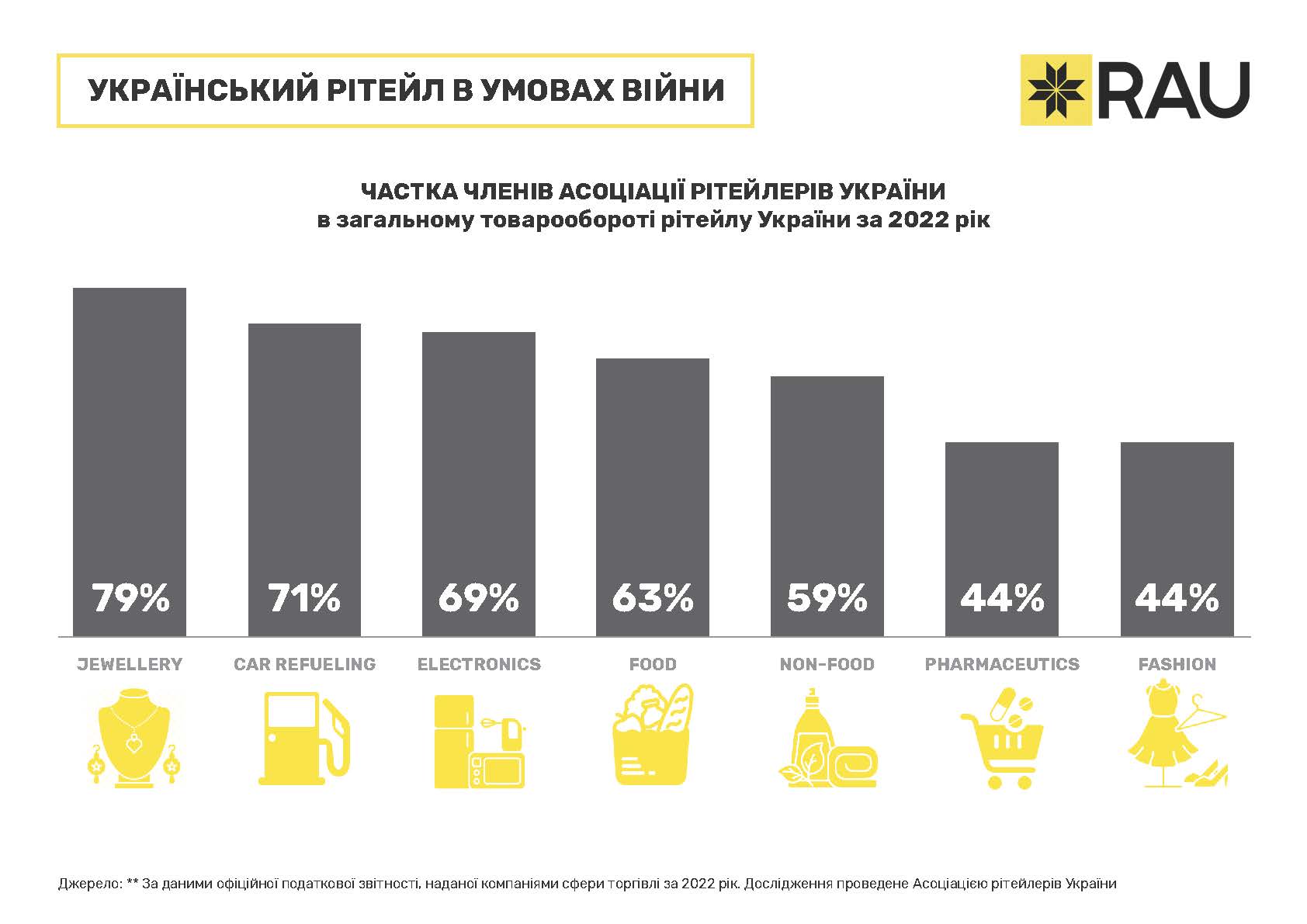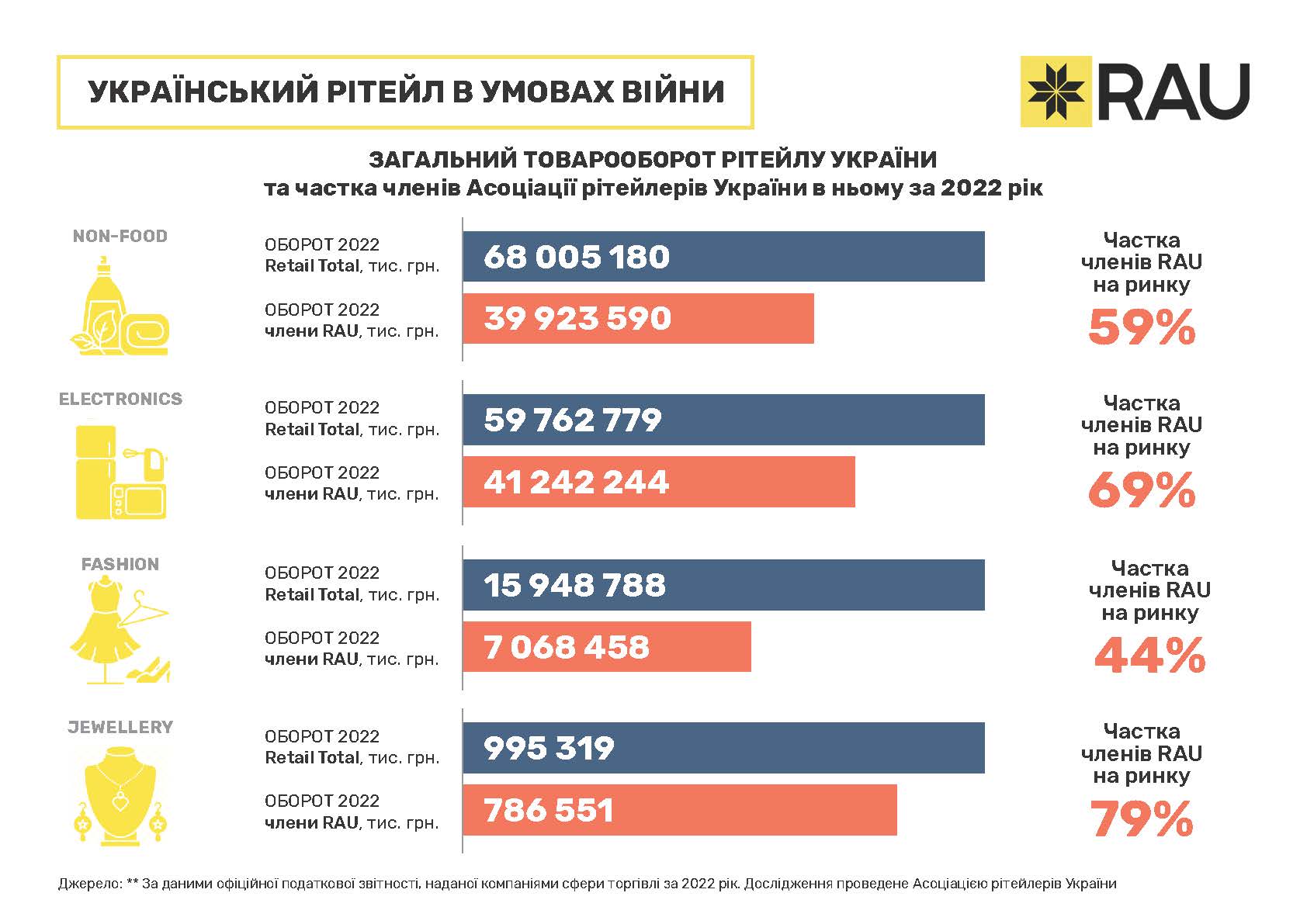Загалом, компанії, що входять до RAU формують помітну частку в загальному товарообороті мережевих гравців. Найповніше вони представлені в ювелірній сфері – 79%. З цього напрямку до Асоціації входять всі провідні гравці: Золотий Вік, Укрзолото, SOVA, Автозаправки, які є членами RAU, забезпечують 71% від загальної виручки сектору, магазини техніки та електроніки – 69%, продуктові рітейлери – 63% тощо.