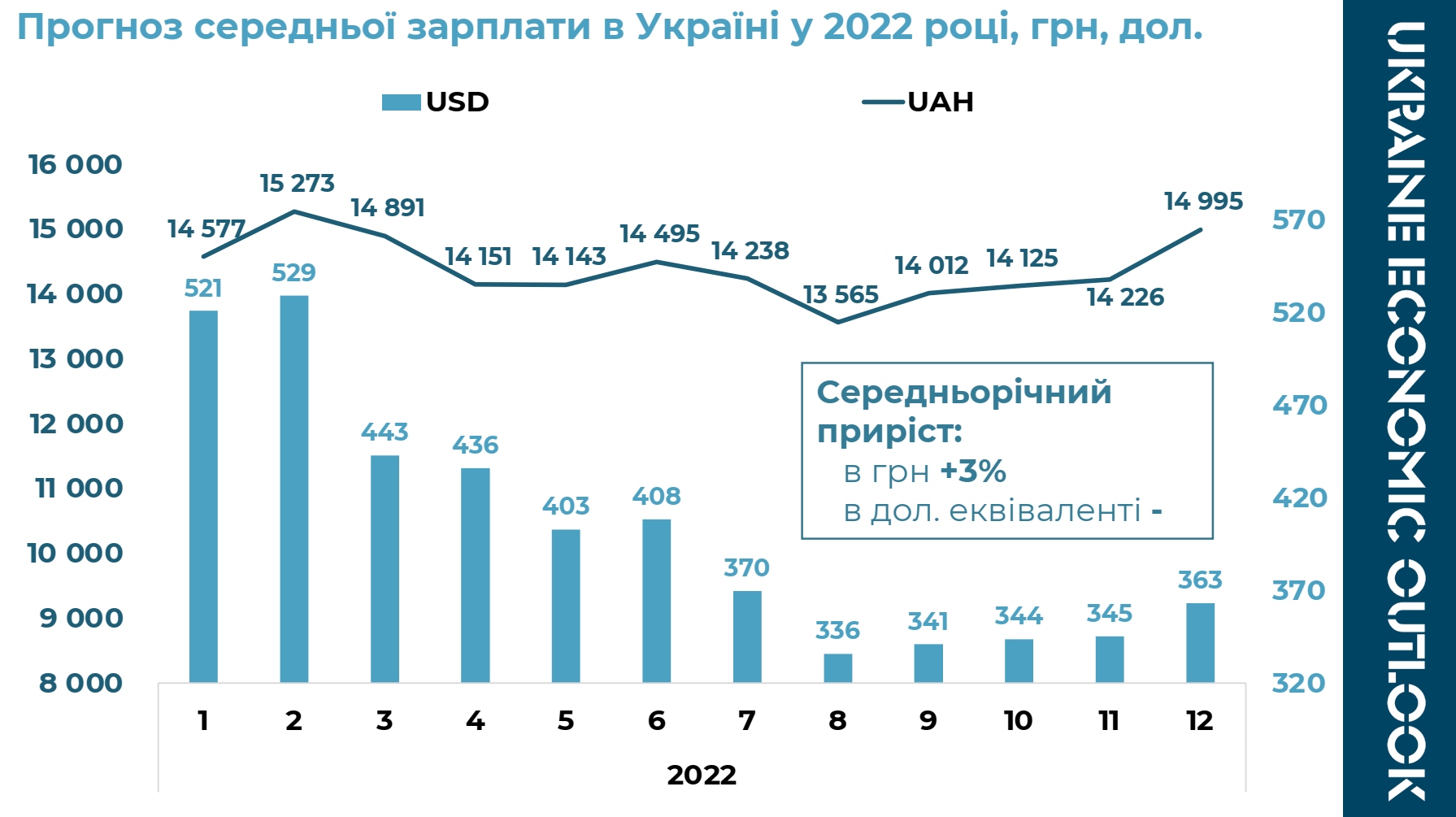 На наступний рік, з огляду на те, що війна продовжиться весь рік, прогнозується 10% девальвація гривні і, відповідно: при збереженні номінальних зарплат, впаде їх купівельна спроможність як у гривневому, так і в доларовому еквіваленті. Але наприкінці року очікується помітне зростання зарплат, в тому числі за рахунок того, що в деяких регіонах вже відчувається брак робочої сили.