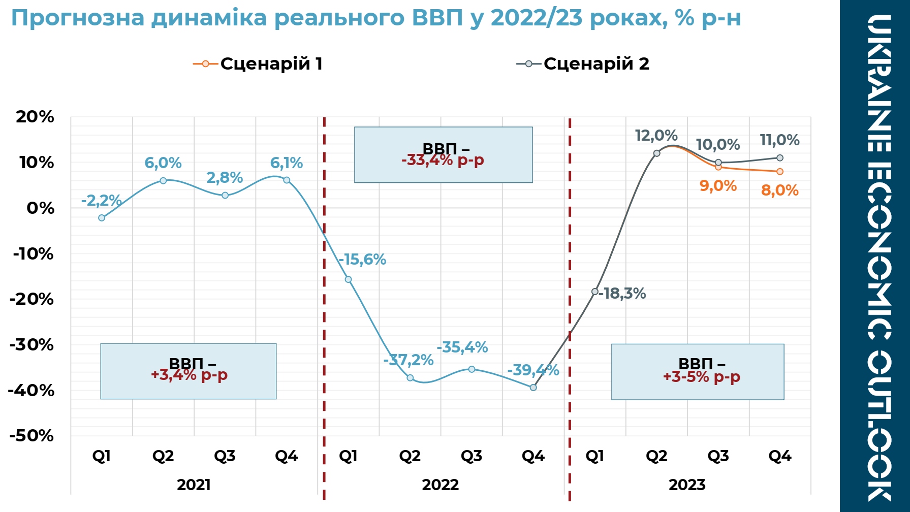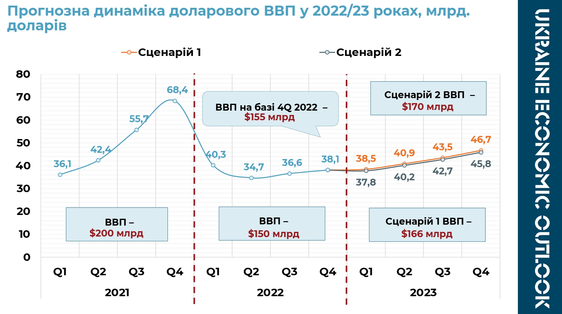 Навіть за помірно-песимістичним сценарієм, який передбачає продовження війни весь 2023 рік, в наступному році очікуємо зростання ВВП в доларовому еквіваленті майже на 10%, до $165-170 млрд.