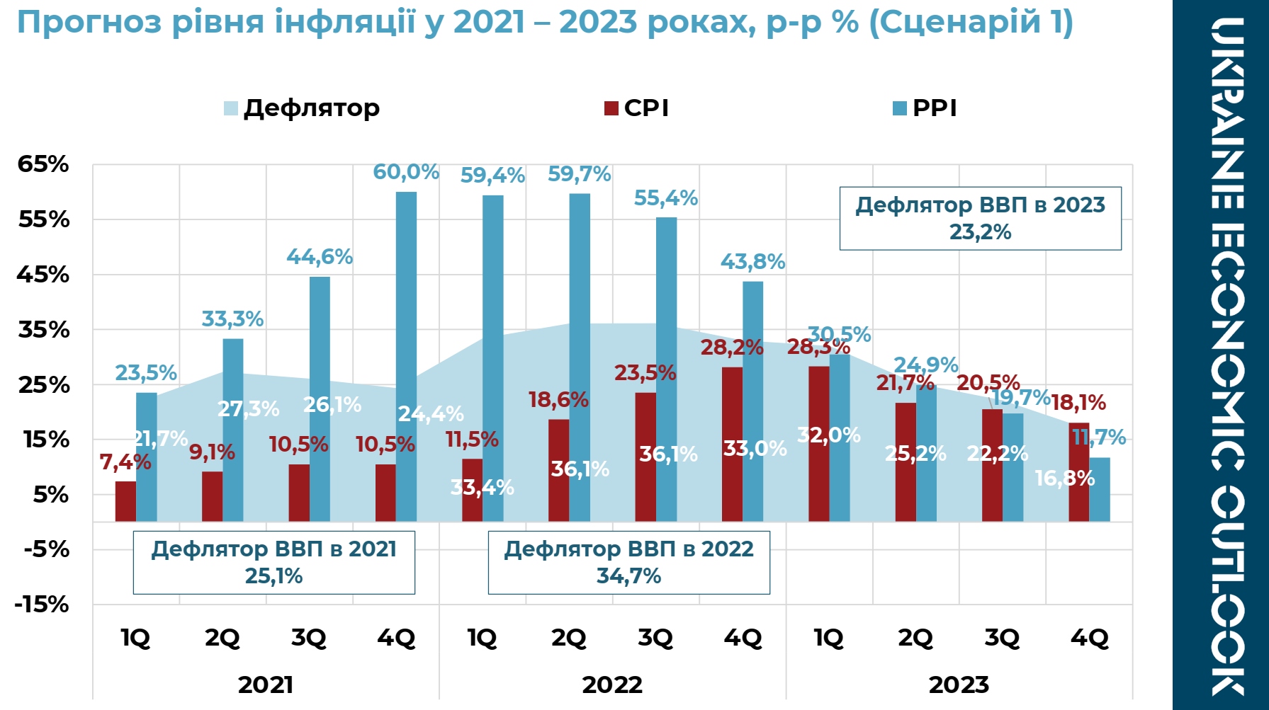 Інфляція або індекс роздрібних цін (CPI) та оптові відпускні ціни виробників (PPI) мають свою окрему динаміку. За допомогою досить складної формули, де враховують зміни цін виробників (переважний вплив тут мають світові ціни на біржові товари), отримують дефлятор ВВП (відношення номінального ВВП до реального), який показує справжній рівень інфляції в країні. Цього року дефлятор ВВП склав майже 35%.