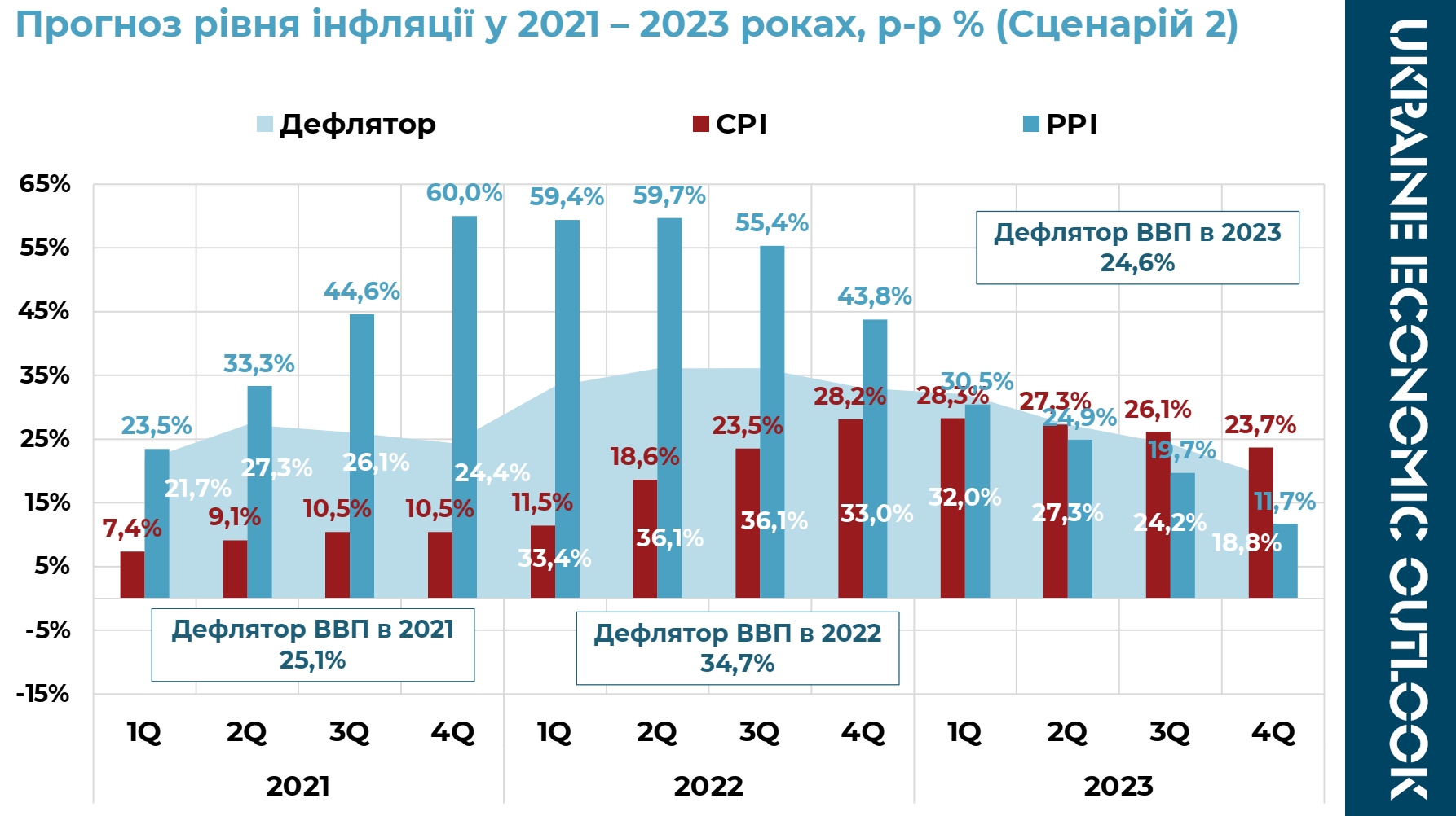 За другим сценарієм свою роль відіграють такі важливі чинники як підняття тарифів на послуги ЖКГ та збільшення мінімальної зарплати до 6700 грн. Як відомо, тарифи наразі штучно стримуються владою і згодом будуть підвищені. А розмір мінімальної зарплати у 6700 вже діє з 1 жовтня 2022 року. Все це інакше вплине на сукупний споживчий попит: виторги рітейлу зростуть, але споживча інфляція буде на рівні 23,7% (а не 18%). Дефлятор ВВП відповідно прогнозується на рівні майже 25%.