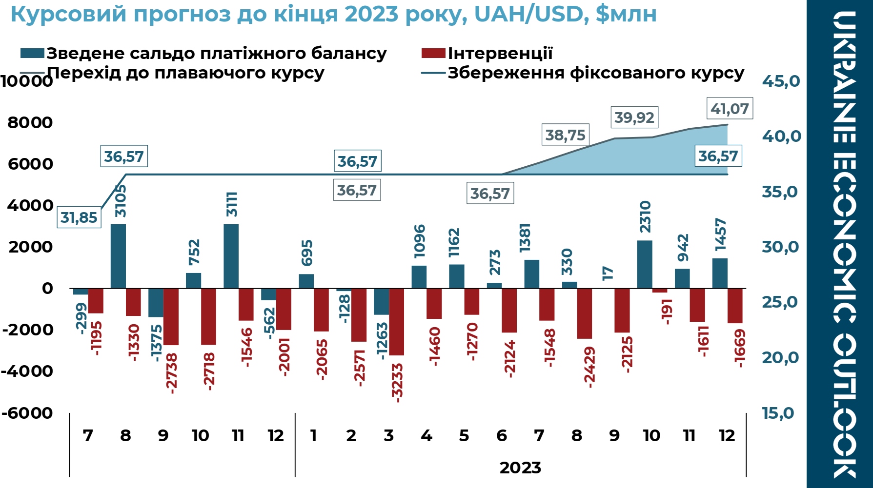 Враховуючи, що готівкою в Україні продається лише 10% іноземної валюти, а 90% – на біржі, прогнози якогось «справжнього» курсу чорного ринку виглядають досить міфічними. Так, дані платіжного балансу України невтішні й експортери можуть бути не задоволені фіксованим курсом НБУ на рівні 36,57 грн/$. Проте, якщо і в 2023 році, як влітку 2022-го Нацбанку доведеться реагувати, аби покращити стан експортерів, можливий варіант переходу до плаваючого обмінного курсу. Тоді станом на кінець 2023 року обмінний курс може дійти до відмітки у 41,07 грн/$. В іншому випадку для втримання фіксованого курсу на нинішньому рівні доведеться так само інтенсивно проводити інтервенції іноземної валюти, спалюючи резерви.