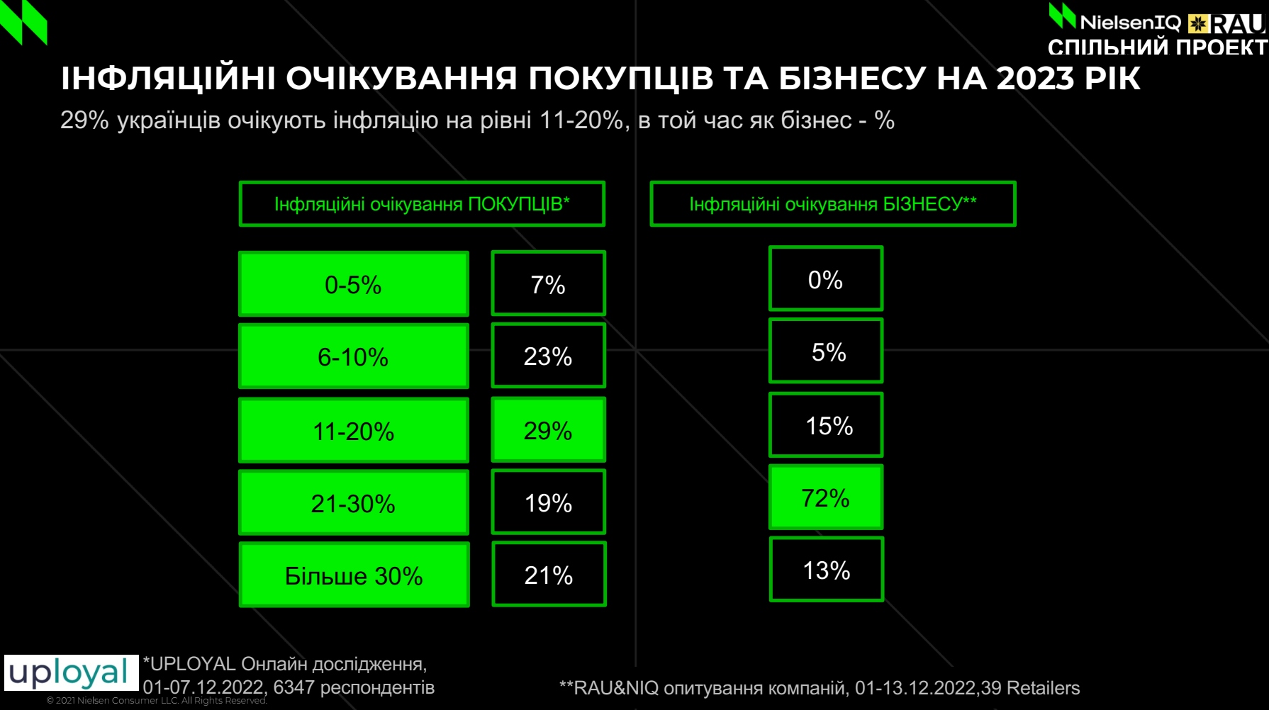 Самі ж українці, далекі від аналітичних розрахунків, згідно з даними опитування майже 7000 споживачів, проведеного компанією Uployal, розраховують на інфляцію в діапазоні 11-20%. Про це заявили 29% респондентів.