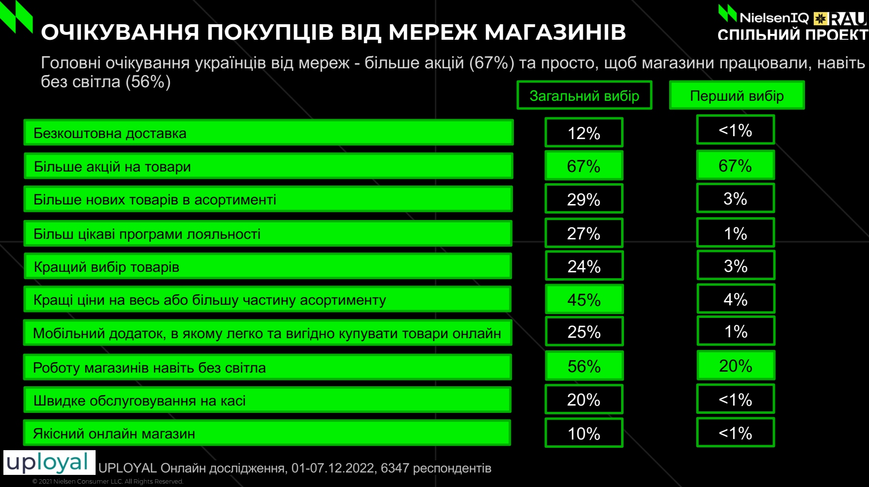 При цьому для 56% споживачів важливі не так ціни, як взагалі сам факт роботи магазину, нехай навіть і без світла. Для п’ятої частини споживачів це найголовніше. Також 67% українців хочуть аби мережі більше проводили акційні продажі товарів і тут вони показують нечувану одностайність, бо так само 67% зробили це своїм першим вибором.