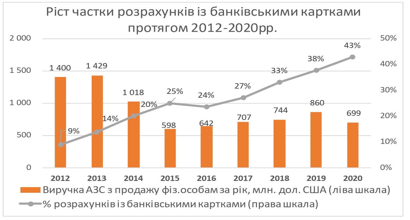 Протягом 2012-2020 років ринок платіжних карт в Україні кардинально змінився – зі слаборозвиненого (частка в оборотах рітейлерів близько 5%), він виріс в самостійний повноцінний ринок (частка в оборотах 45-55%). Ще кілька років тому питома вага розрахунків картками за покупки в мережі АЗС ОККО була на рівні 15-20%, а під час пандемії коронавіруса вона збільшилася до 60-65%.