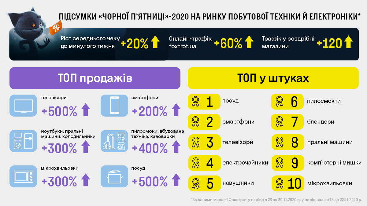 За даними Foxtrot.ua, за тиждень Чорної п’ятниці онлайн-трафік порталу рітейлера зріс на 60% (у співвідношенні рік до року і тиждень до тижня), а частка онлайн-продажів збільшилась до 20% від товарообігу компанії.