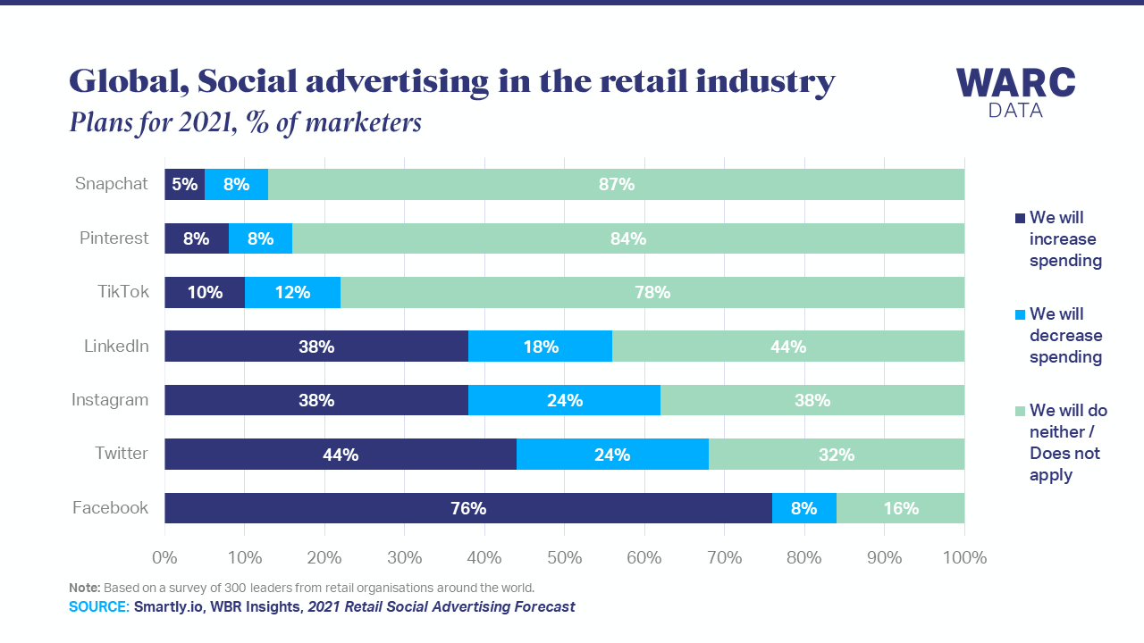 Три чверті (76%) рітейлерів заявили, що в 2021 році вони будуть більше витрачати на рекламу в Facebook. Це також характерно для різних регіонів і сегментів роздрібної торгівлі. У звіті також говориться, що в 2020 році Facebook залучив інвестиції від 93% рітейлерів, в той час як аналіз даних WARC показує, що Facebook зайняв 15,1% ринку глобальної реклами.
