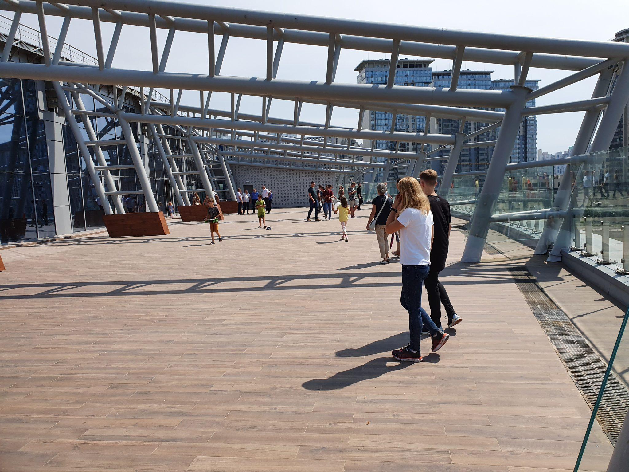 Однією з головних особливостей об’єкта стало його розташування на набережній. Щоб насолодитися видом, вже в перший день роботи в ТРЦ відкрили літню терасу. Правда прекрасний пейзаж видно поки переважно з літньої тераси одного з ресторанів. Для інших відвідувачів крізь скло поки відкривається в основному вид на будівництво і житловий квартал.