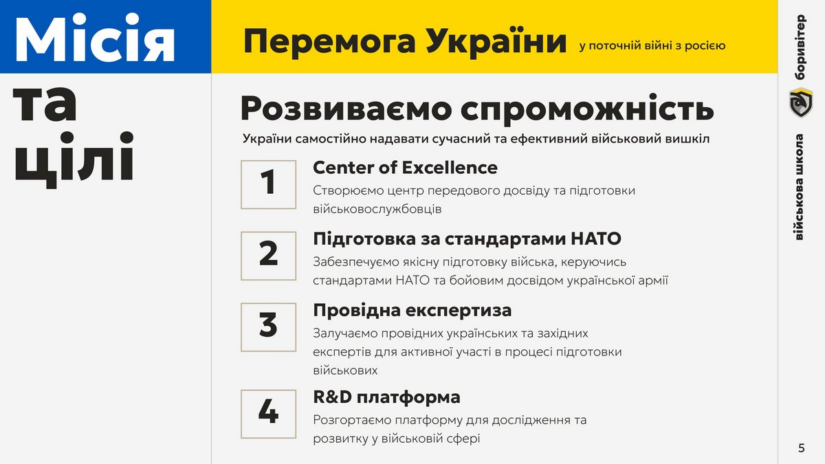 Це не дублювання функцій МО, а допомога громадянського суспільства в умовах, коли чисельність збройних сил збільшилася в чотири рази, а всі іноземні місії інструкторів виїхали з початком бойових дій. Наші ж інструктори опинилися на фронті як найбільш досвідчені бійці, а навчальні центри МО – під загрозою ракетних обстрілів. В таких умовах довелося шукати гнучкі адаптивні рішення з підготовки особового складу. Якраз тут і сформувалася місія та цілі військової школи Боривітер.