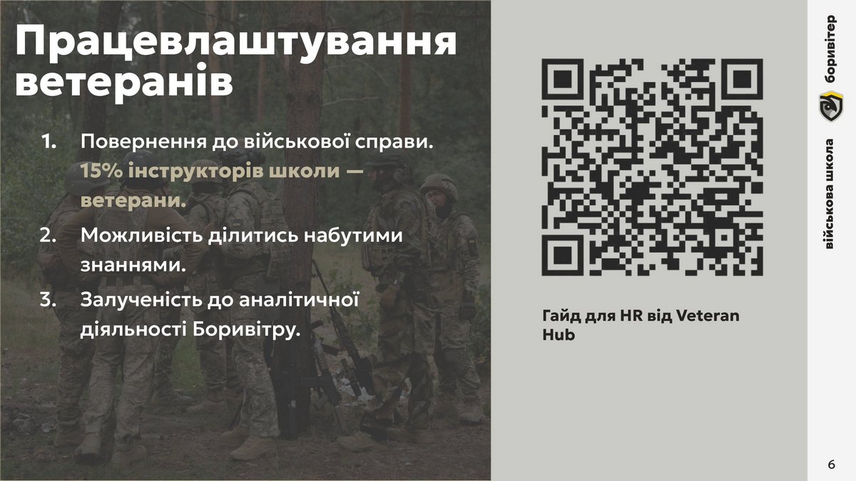 Причому в даному випадку не йдеться про якісь HR-здібності роботодавця, а про співпадіння цінностей кандидата і організації, куди він прийшов на роботу. Людина відчула себе на своєму місці, де вона може допомагати країні вже не в якості військовослужбовця, а інструктора. Наразі в Боривітер 15% персоналу – це ветерани.
