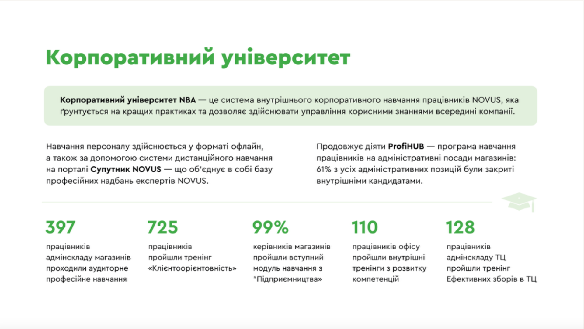 Як засіб нематеріального заохочення персоналу в Novus працює ProfiHub — програма навчання працівників на адміністративні посади магазинів. Торік 61% усіх адміністративних позицій були закриті внутрішніми кандидатами. Діє також Корпоративний університет NBA, де навчання здійснюється в онлайн-форматі та за допомогою системи дистанційного навчання на порталі «Супутник», який функціонує як база професійно-експертних знань і надбань компанії.