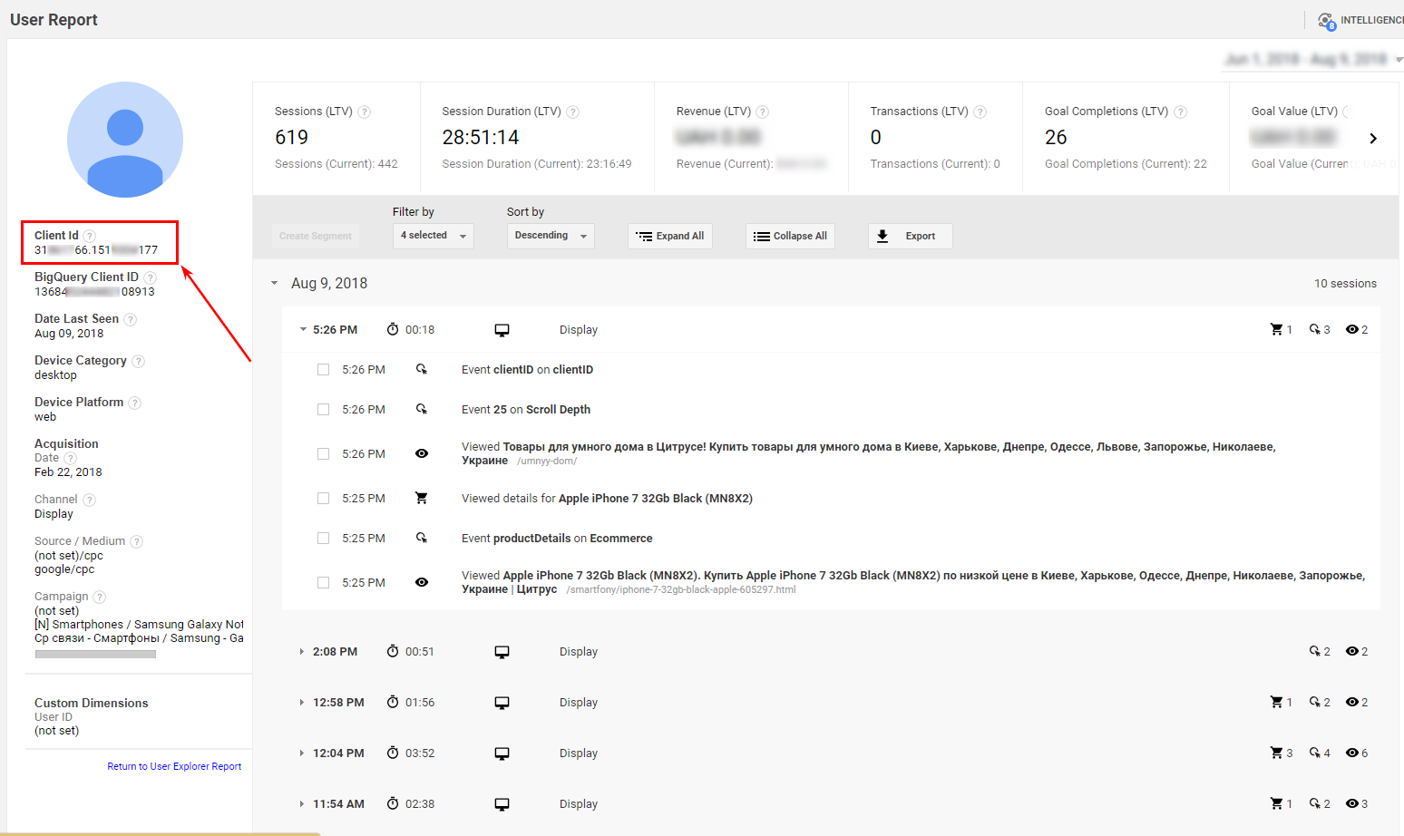 Завдання об’єднати ваш існуючий UserID c ClientID в будь-який момент авторизації або реєстрації користувача, заповнення форми зворотного зв’язку або підписки на розсилку. У Google Analytics, в розділі Google Analytics> Audience> User Explorer, можна отримати всю необхідну інформацію по ClientID користувача (всі його дії, покупки, джерела трафіку), наприклад: