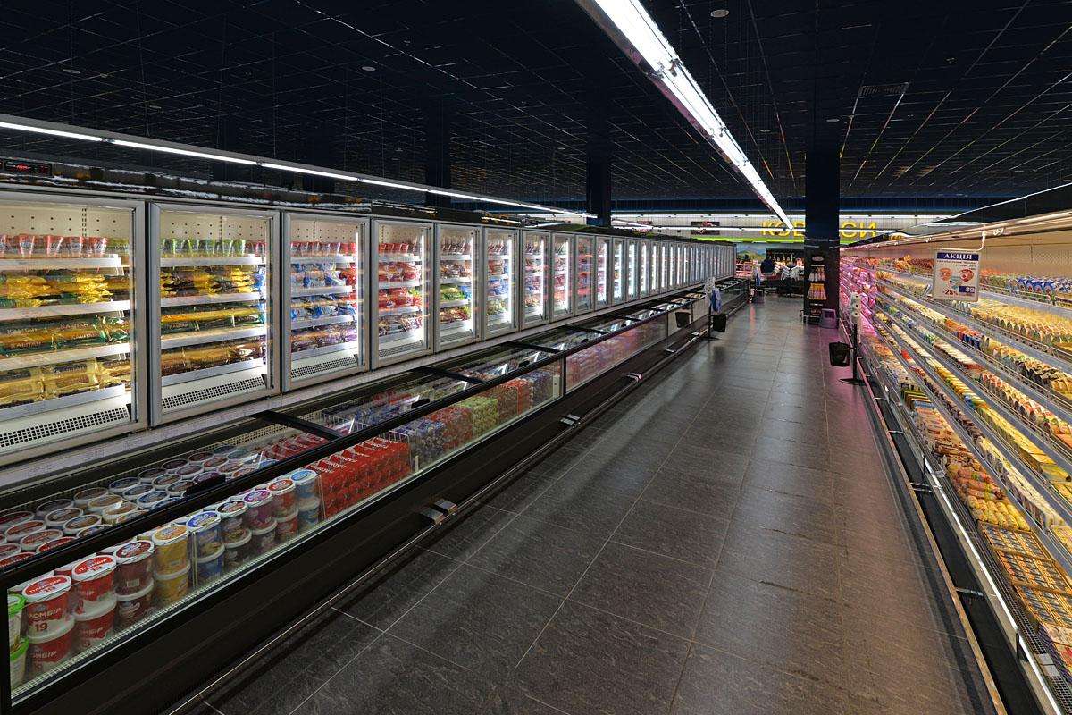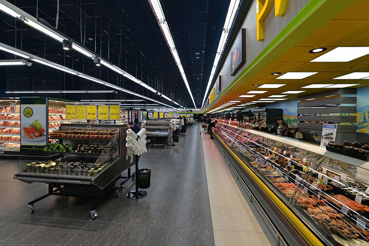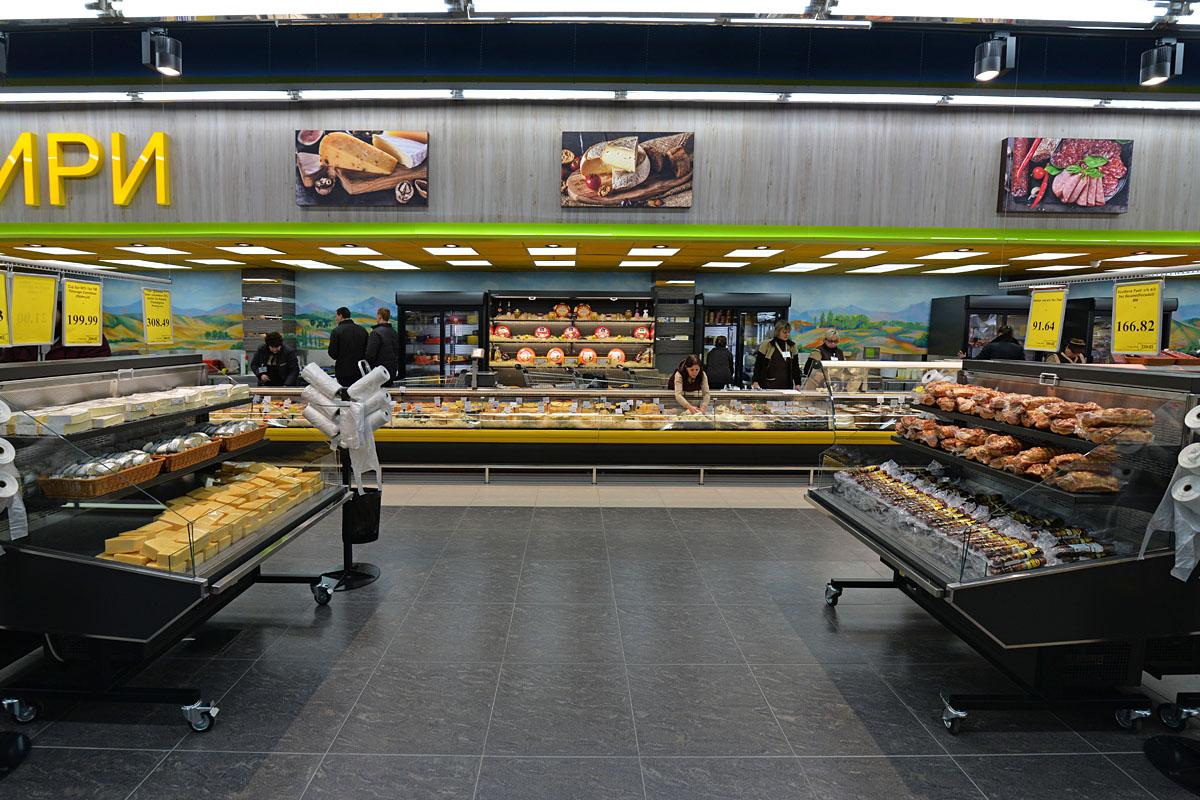 Гастрономічні відділи гіпермаркету традиційно для мережі РОСТ обладнані холодильними вітринами з радіусним склом. Для зберігання товарного запасу в зоні роботи продавців були встановлені пристінні вітрини.
