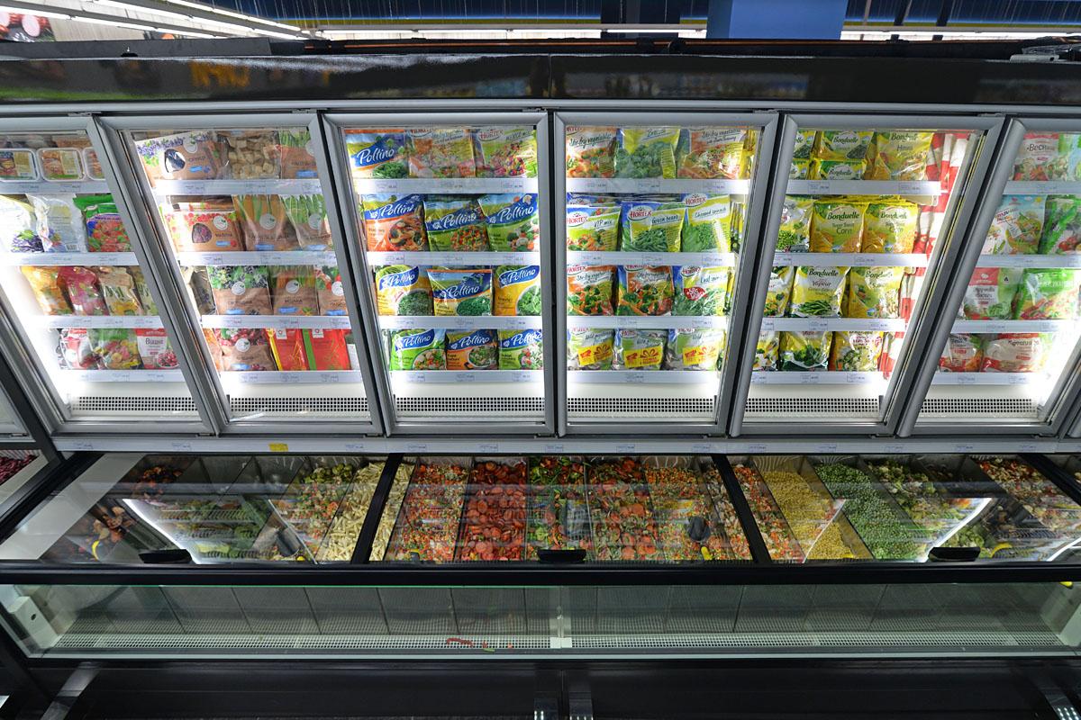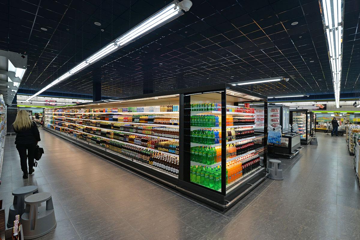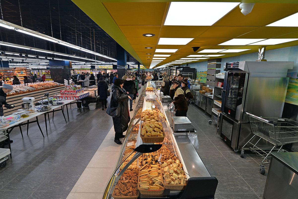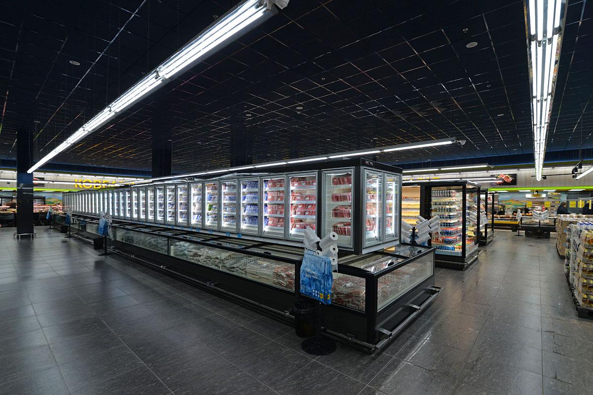 Гастрономічні відділи гіпермаркету традиційно для мережі РОСТ обладнані холодильними вітринами з радіусним склом. Для зберігання товарного запасу в зоні роботи продавців були встановлені пристінні вітрини.