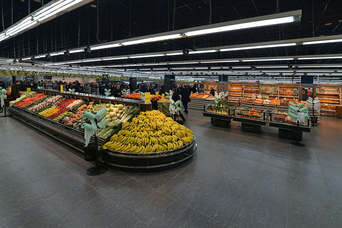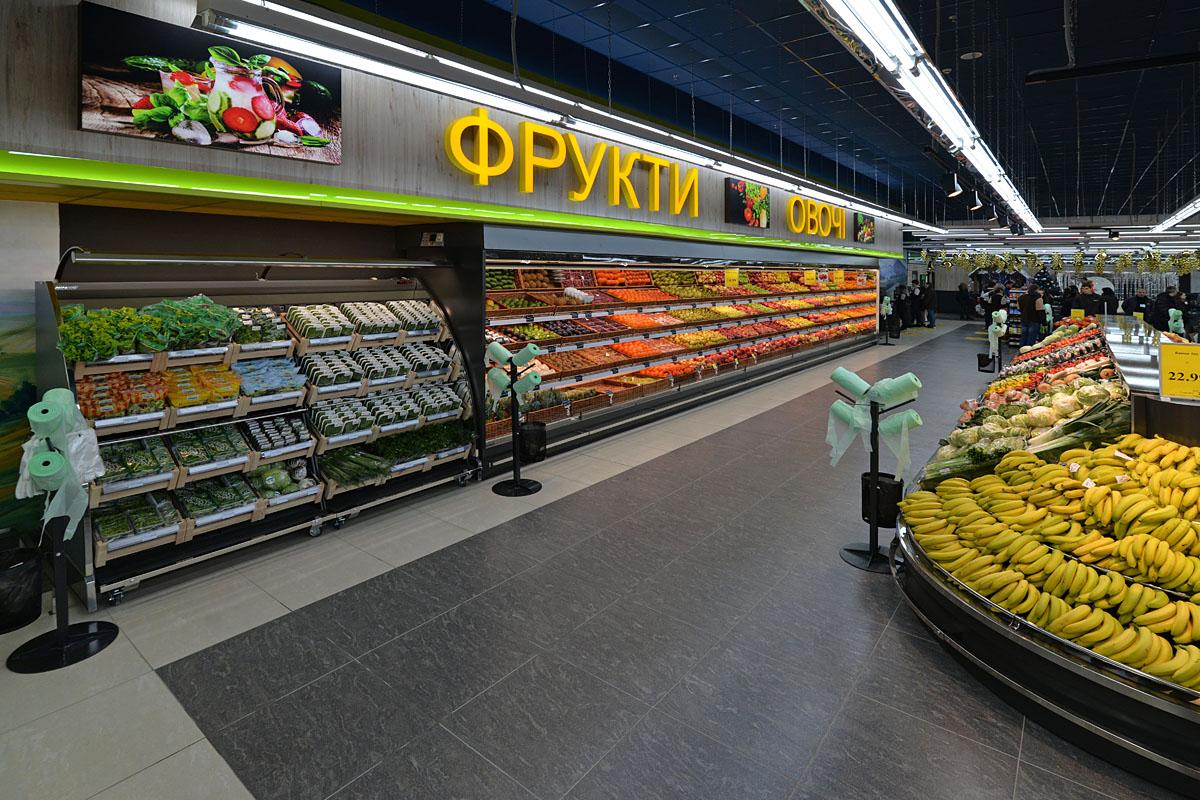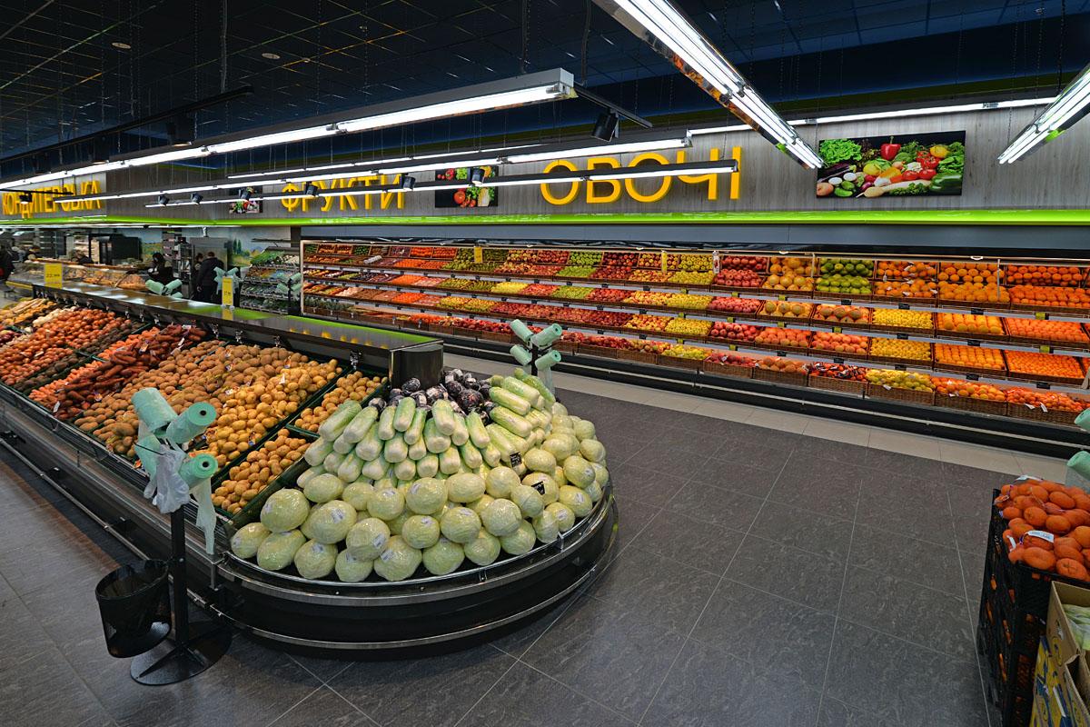 Багато місця виділено під свіжі овочі та фрукти, як традиційні, так і екзотичні для українського ринку.