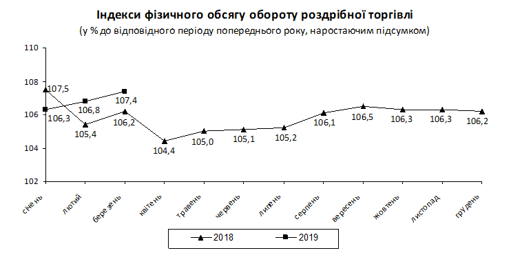 Про це повідомляє Державна служба статистики України. Як зазначається у релізі відомства, сезонно скоригований індекс фізичного обсягу обороту роздрібної торгівлі в січні–березні 2019 року відносно січня–березня 2018-го у порівнянних цінах становив 107,2%.