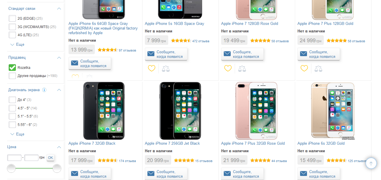 Ще навесні цього року товари бренду Apple у Rozetka були доступні, однак в травні їх уже не було. Якщо відфільтрувати продукцію по продавцеві, то можна побачити в асортименті Rozetka лише відновлені версії iPhone. Нові пристрої відзначені сірої плашкою «немає в наявності». Це стосується також комп’ютерної техніки. Кілька гаджетів Apple залишилися в продажу – ймовірно, це складські залишки.