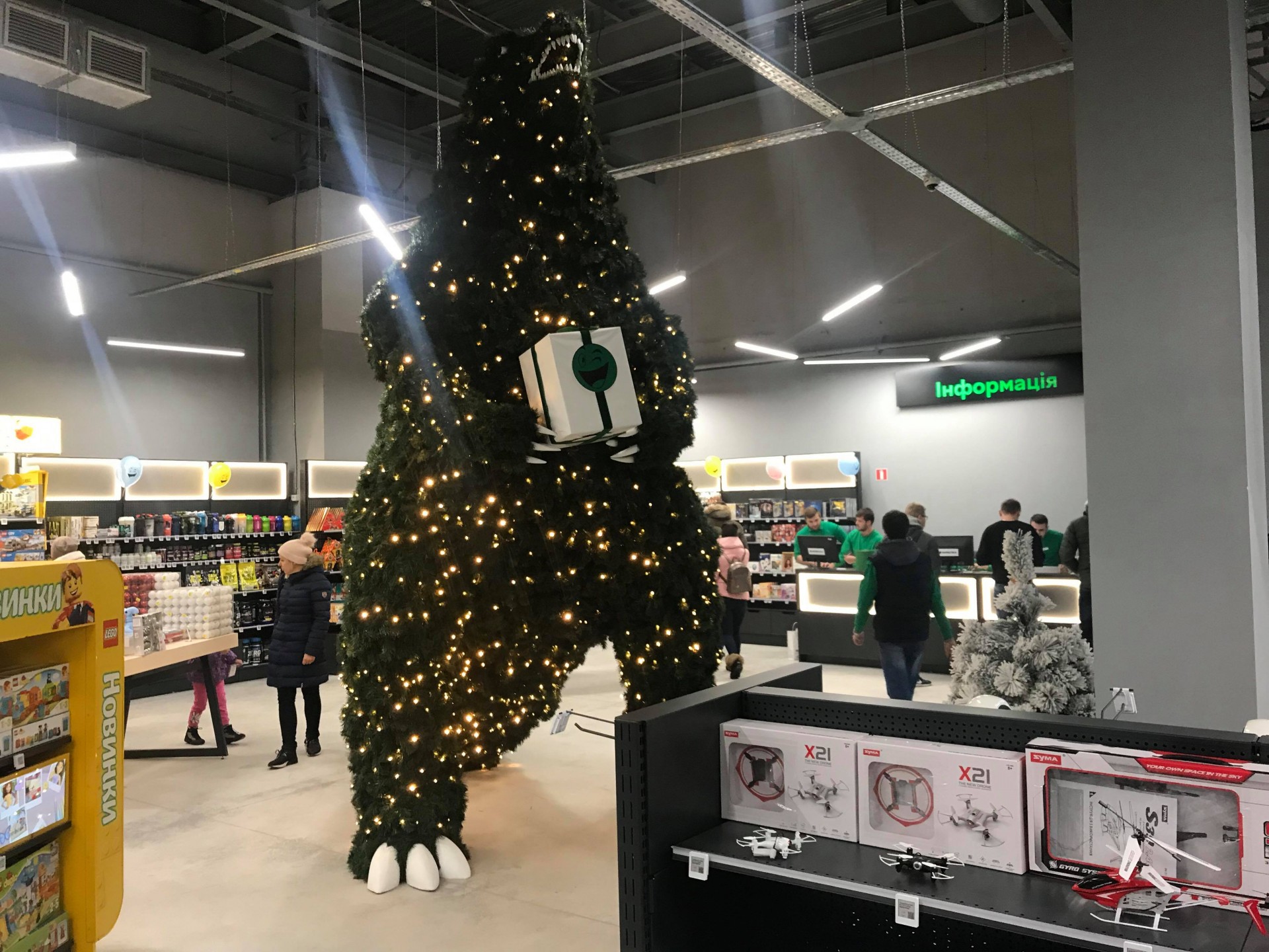 У магазині зі входу відвідувачів зустрічають електронні термінали Check in, є лінія видачі інтернет-замовлень, відділ з алкоголем, представлено й безліч інших груп товарів, є примірочні. У центрі залу розташована тематична фотозона – величезний динозавр зі смайлом Rozetka.