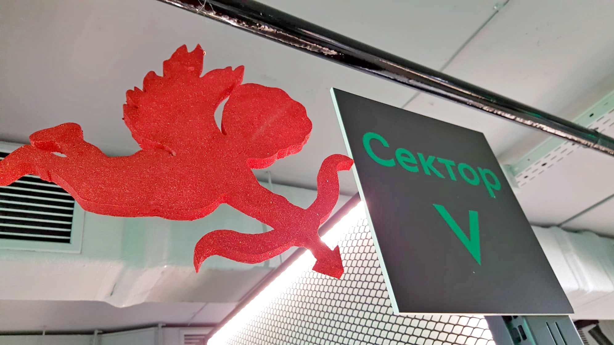 Зі входу в магазині відвідувачів зустрічають електронні термінали Check in, над якими повисла тінь давньоримського бога любові Амура. Напередодні Дня Святого Валентина співробітники магазину заздалегідь прикрасили торговий простір пластиковими “купідончиками” і серцями, які в світлі денних ламп нависають над прилавками.