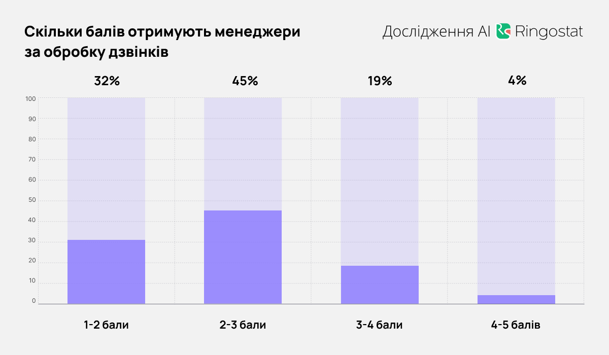 Аналіз дзвінків за допомогою ШІ включає загальну оцінку діалогу. Вона складається з оцінки за кожен етап типової розмови: відкриття, виявлення потреб, презентація товарів та компанії, завершення діалогу. Середня оцінка, яку отримали проаналізовані розмови — лише 2 з 5 балів, 77% розмов мають оцінку 3 та нижче, а оцінку 5 отримали лише 1% діалогів.