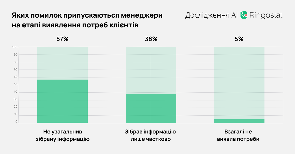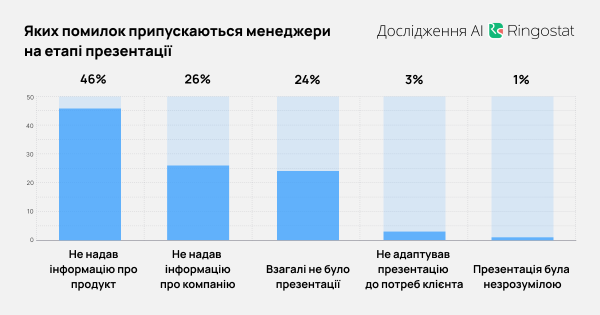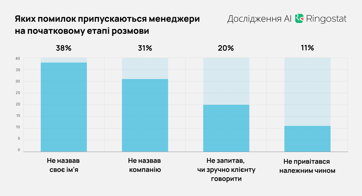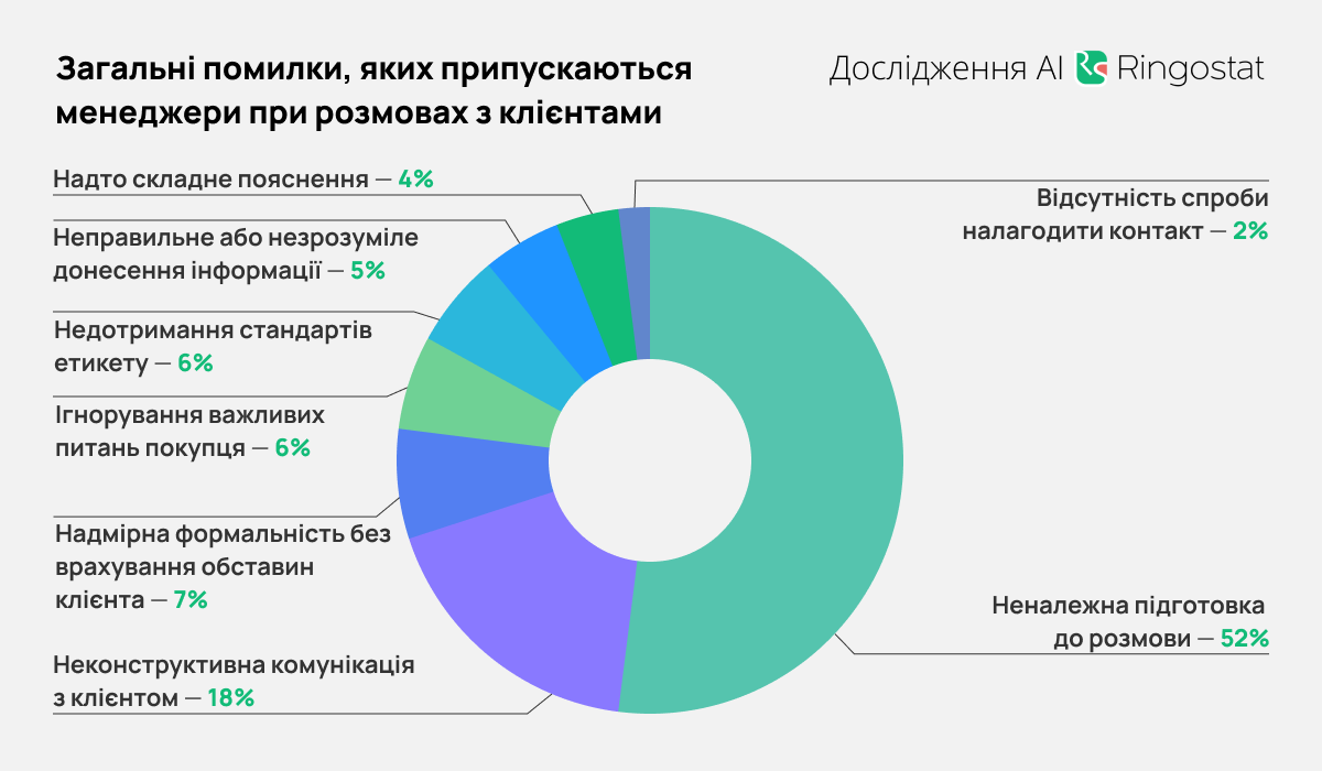 - Більше половини загальних помилок — недостатня підготовка менеджера до розмови. Співробітник не володіє базовою інформацією про клієнта або продукт, через що створюється враження непрофесійності.