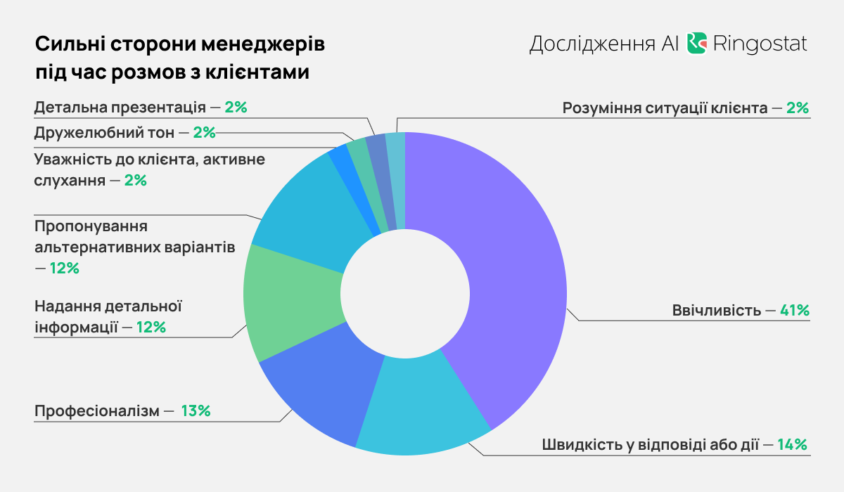 AI виявив і позитивні моменти при аналізі розмов. У 41% випадків менеджери були ввічливими, у 14% — демонстрували швидкість у відповіді або дії, у 13% — професіоналізм тощо. Проте лише у 2% діалогів рідше траплялися випадки уважності для клієнта, розуміння його ситуації, дружелюбність та вміння робити детальну презентацію.