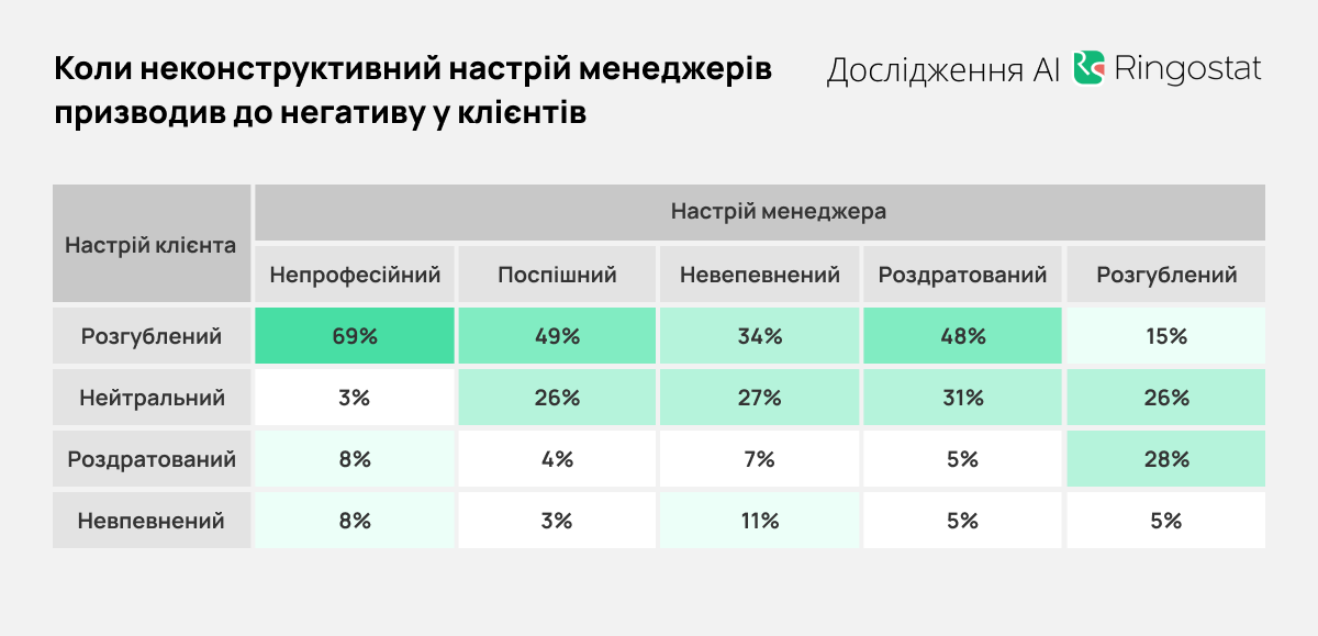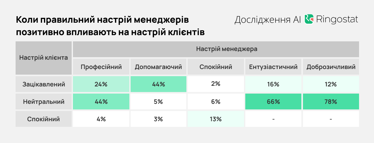 Також Ringostat завдяки штучній моделі Claude A проаналізували вплив настрою менеджерів на настрій клієнтів. В таблицях нижче показано, як часто певний настрій менеджера співпадав з певним настроєм клієнта. В колонках показаний % від усіх випадків, коли у працівника був конкретний настрій.