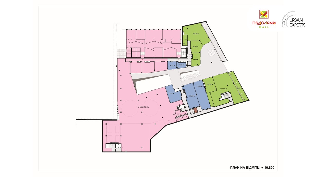На другому – розмістяться торгові галереї. На третьому поверсі буде дитячий розважальний центр площею 3200 кв. м та сучасний фуд-корт з виходом на тераси. Четвертий поверх стане продовженням сфери дитинства та розваг.
