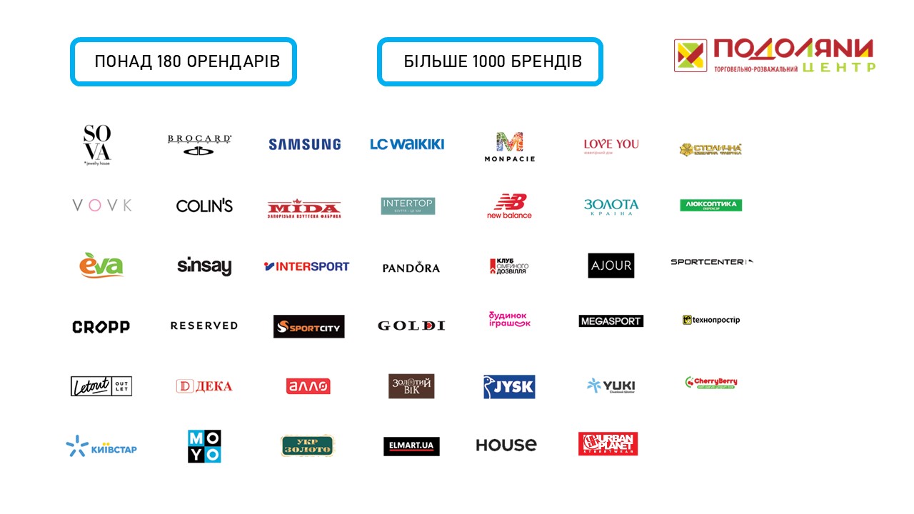 Серед майже двох сотень орендарів в ТРЦ представлені понад 1000 національних і міжнародних брендів. Зокрема, торгова галерея представлена магазином Сільпо в ексклюзивному форматі на 8000 кв. м, а також торговими точками польського ритейлера LPP під брендами Reserved, Cropp, Sinsay та House (з’явився в 2024 році). Також тут широко представлені мережі спорттоварів – бренди Intersport, Sport City, New Balance тощо, а також відомі представники сегменту fashion, такі як LC Waikiki, Colin’s та багато інших.