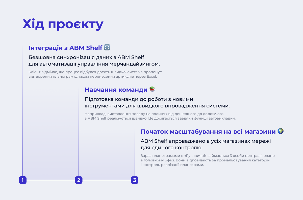 Впровадження рішення для управління мерчандайзингом у Рукавичка відбувалося у кілька етапів. Спочатку – інтеграція облікової системи з ABM Shelf, потім – навчання команди, і тільки після цього рішення почали масштабувати на всі магазини.