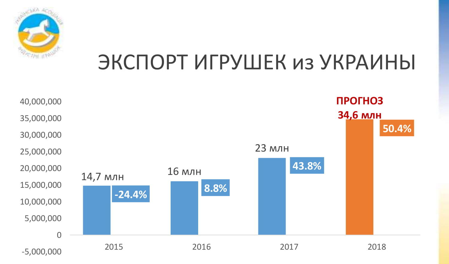Зростає також експорт іграшок з України, який до кінця 2018-го збільшиться на 50,4%. У фінансовому еквіваленті це відповідає сумі в $34,6 млн.