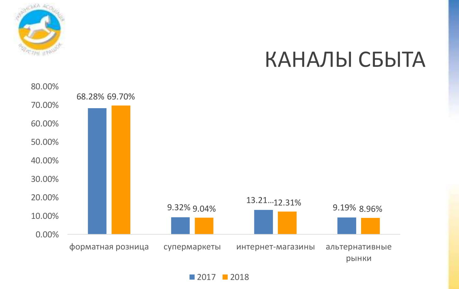 По каналах збуту в Україні безумовним лідером є спеціалізований роздріб. За даними УАІІ, за останній рік він виріс всього на 1,5%, але при цьому забезпечує колосальні 69,7% загальних продажів. Магазини більш широкої спеціалізації, для яких іграшки – лише деяка частина асортименту, продають 9,04% іграшок.