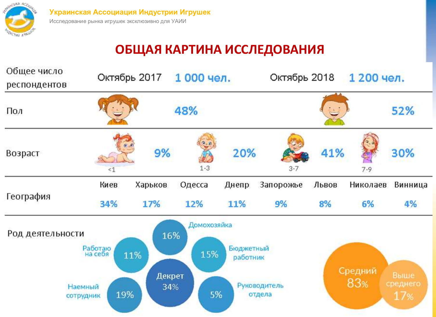 В рамках дослідження, проведеного спільно УАІІ і OSD Group, опитано 1200 батьків у восьми найбільших містах України. З них 48% мам і 52% батьків. Як з’ясувалося, основною особою, яка приймає рішення про вибір іграшки, залишається мама – 69,19%. Роль папи в ухваленні рішення, хоч незначно, але продовжує знижуватися на 0,5% і досягла 17,71%. Роль дитини зросла на 4% в порівнянні з дослідженням 2017 року і досягла 13,1% всіх рішення у виборі іграшки.