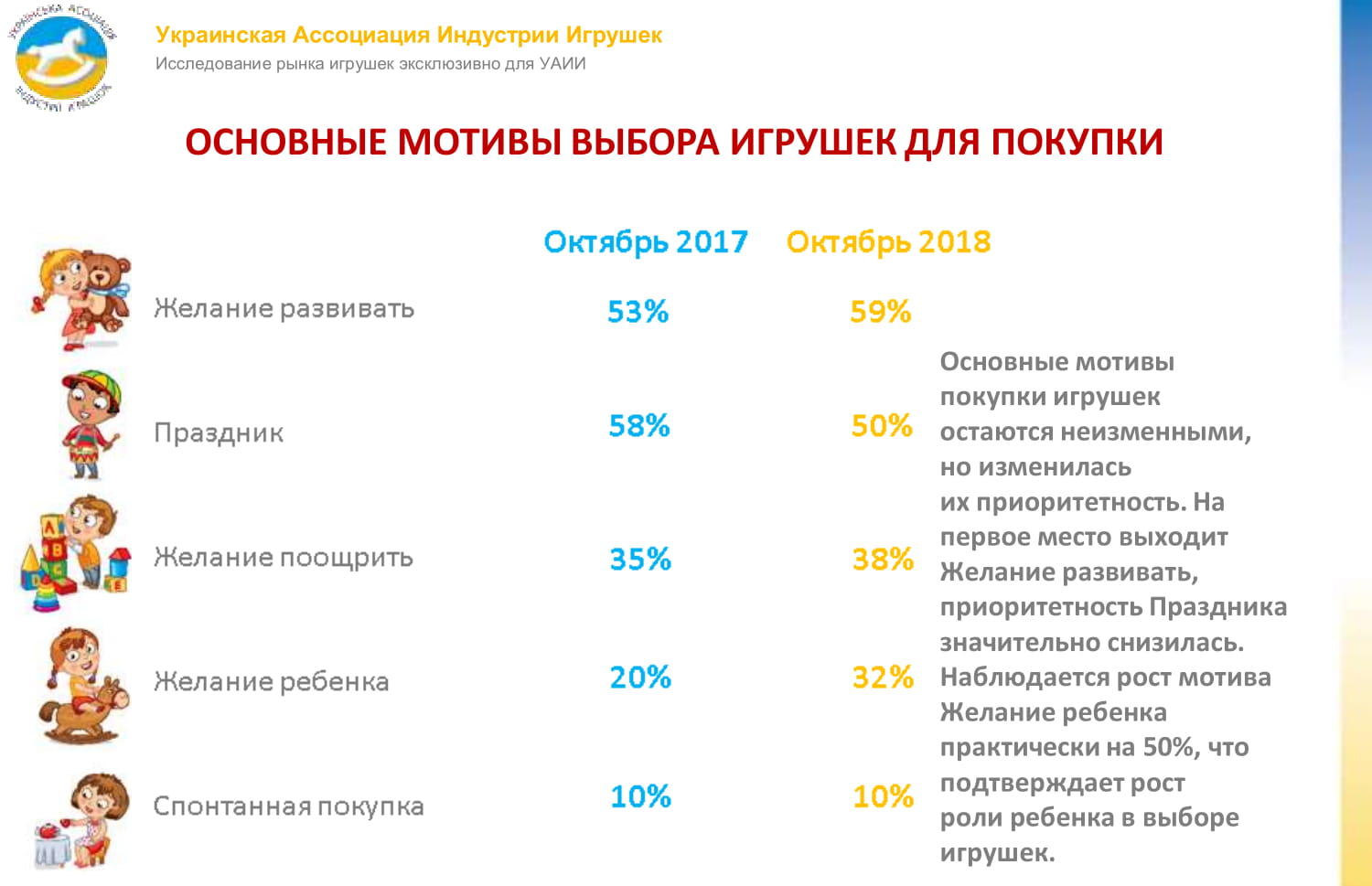 Основні мотиви покупки іграшок в порівнянні з 2017 роком залишаються незмінними, але змінилася їх пріоритетність. На перше місце вийшло бажання розвивати дитину з 59%, а пріоритетність святкових приводів знизилася до 50% у порівнянні з 58% рік тому. Спонтанні покупки іграшок у батьків трапляються лише в 10% випадків.