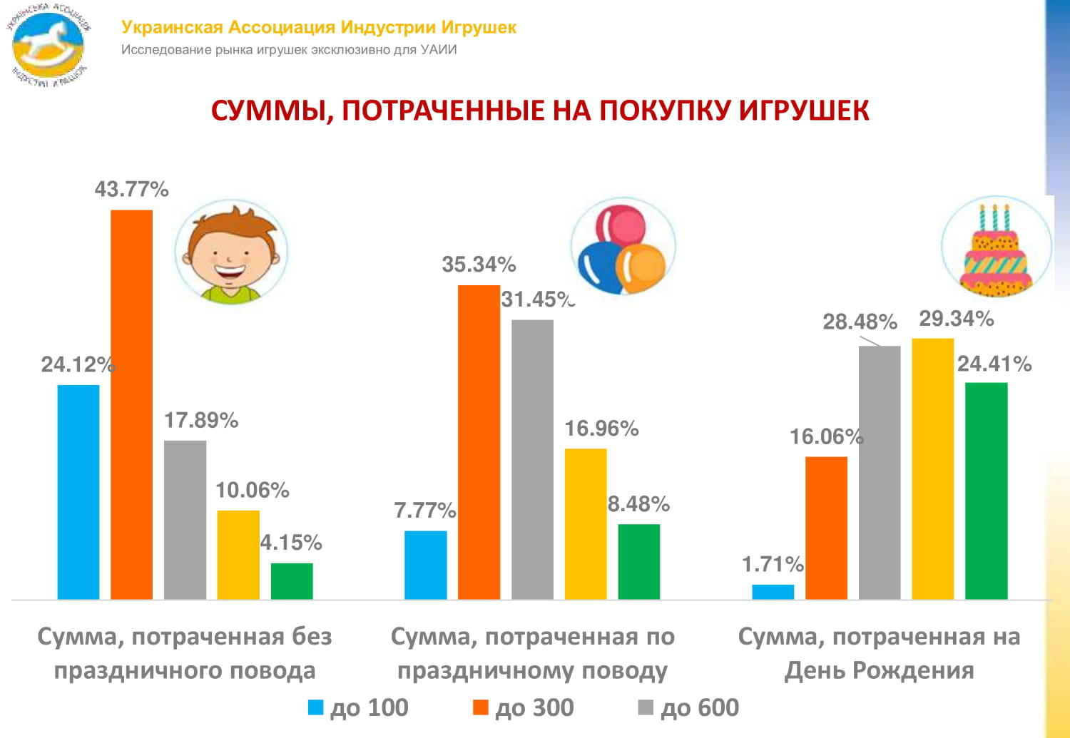 До 600 грн зі святкового приводу витрачає 74% опитаних батьків. Водночас кількість респондентів, які витратили на покупки понад 1000 грн, зросла за рік вдвічі з 4% до 8,48%. Безпосередньо іграшки продовжують залишатися найбільш поширеним подарунком. Але популярність гаджетів і одягу також продовжує незмінно рости: гаджети дарують 10,11% батьків, що робить магазини техніки та електроніки свого роду новим конкурентом магазинам іграшок. Одяг же піднявся з 4,28% до 5,06% за рік.