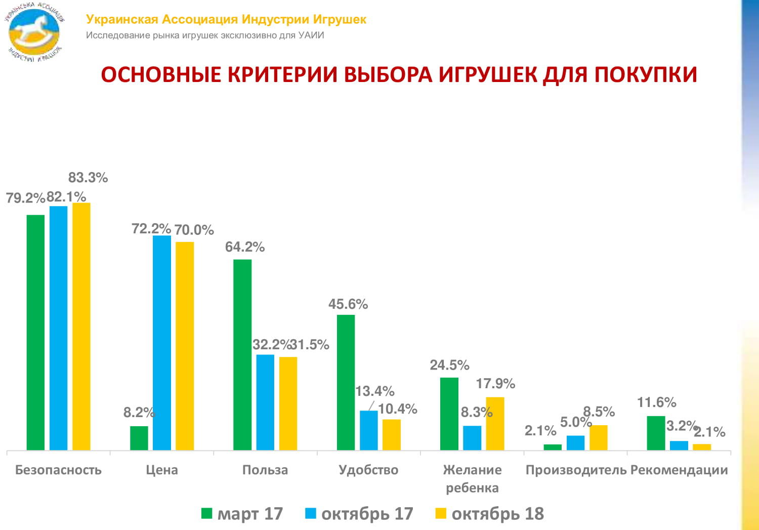 Основні критерії вибору іграшки залишилися незмінними: безпека і ціна. Роль ціни незначно знизилася з 72,2% до 70% важливості, роль бажання дитини зросла практично в два рази в порівнянні з попереднім дослідженням. Продовжують знижуватися важливість зручності, користі та рекомендації, що свідчить про те, що в 2018 році респонденти більше ґрунтуються на власних уподобаннях і бажання дитини.