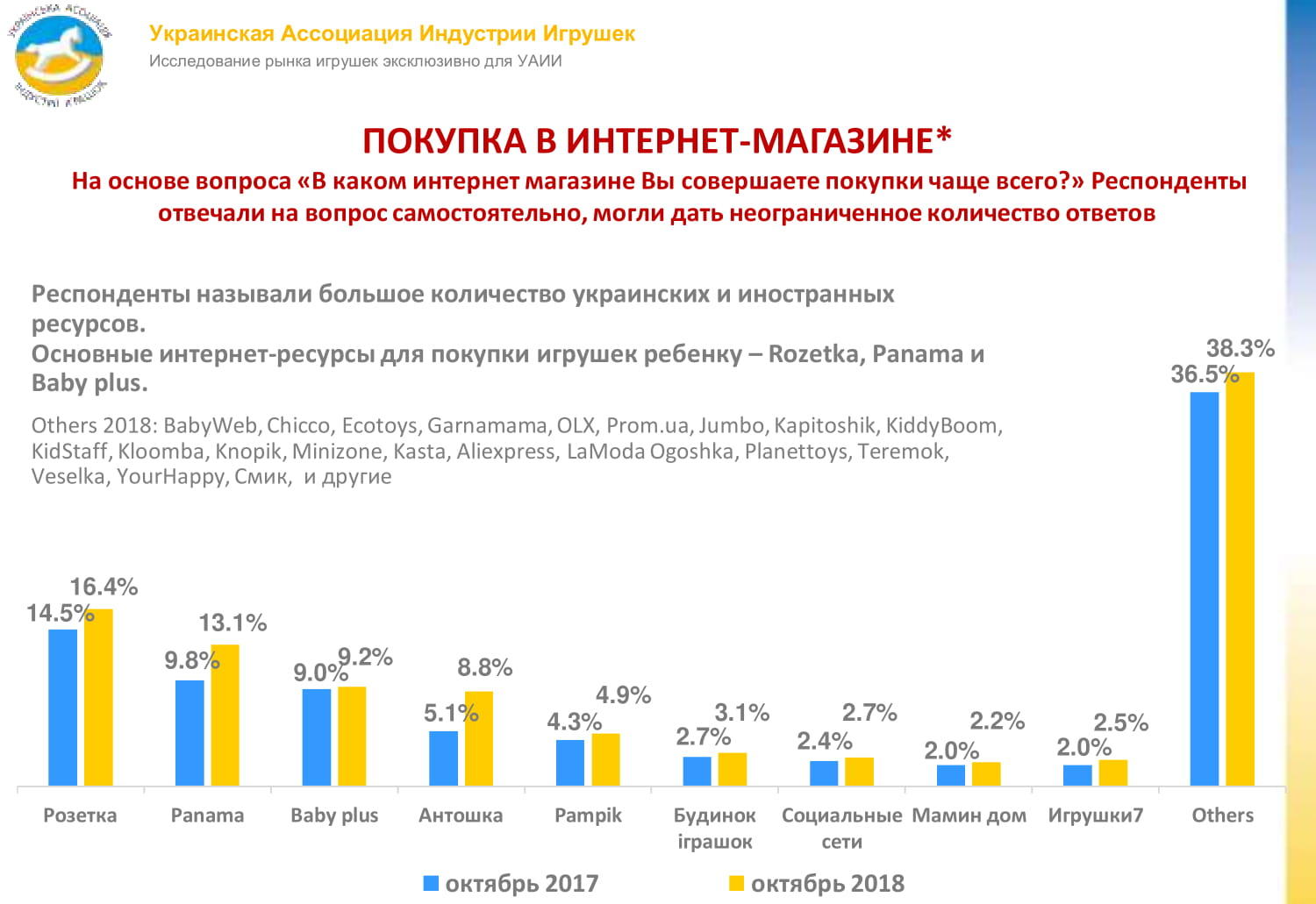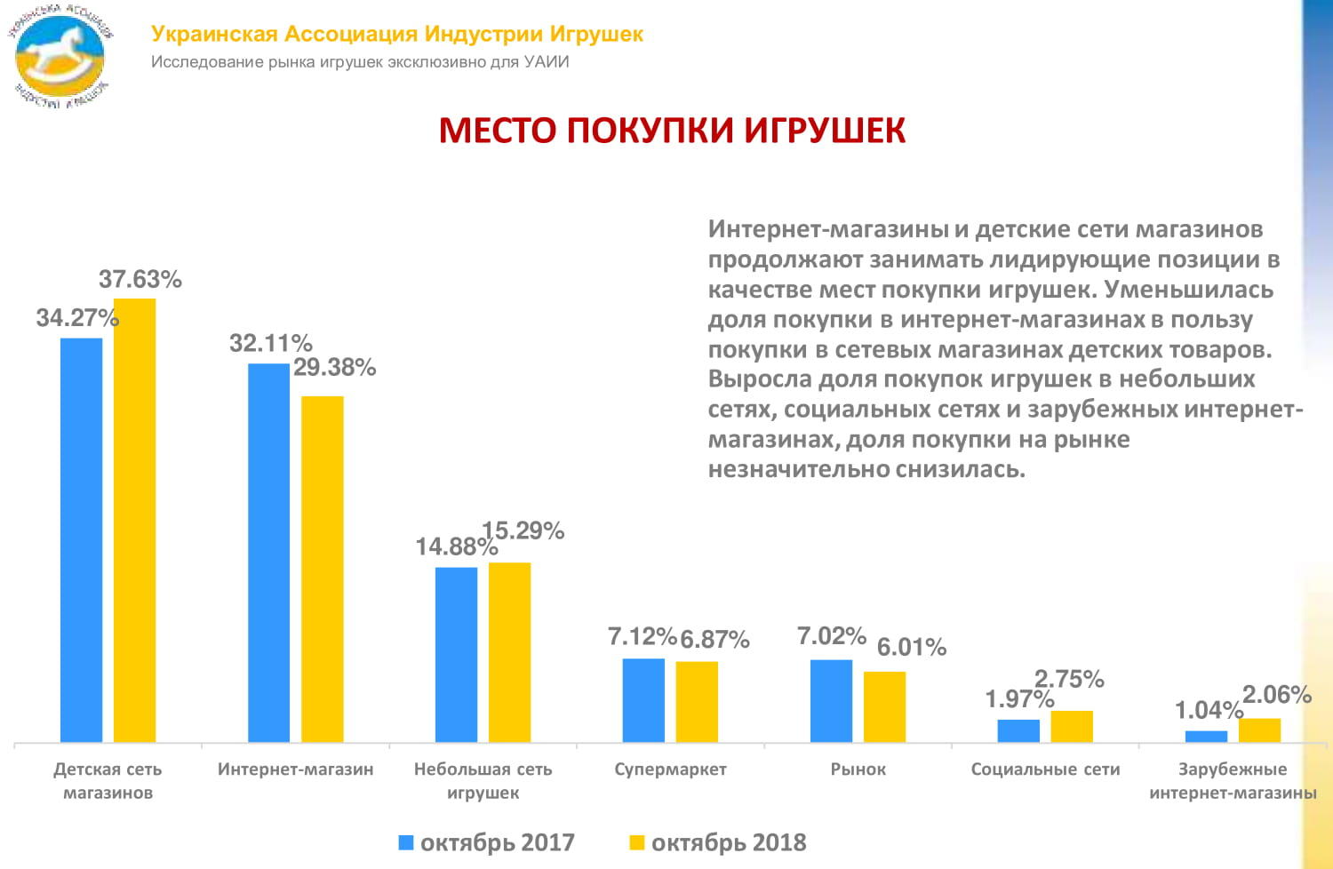 Інтернет-магазини та дитячі мережі продовжують займати лідируючі позиції в якості місць покупки іграшок – 37,63% і 29,38% відповідно. Але частка покупки в інтернет-магазині зменшилася майже на 3% на користь покупки в мережевих магазинах дитячих товарів. Тренд соціальних мереж продовжує розвиватись і виріс більш, ніж на 50% з 1,97% до 2,75% від частки всіх місць, обраних для покупок споживачами.