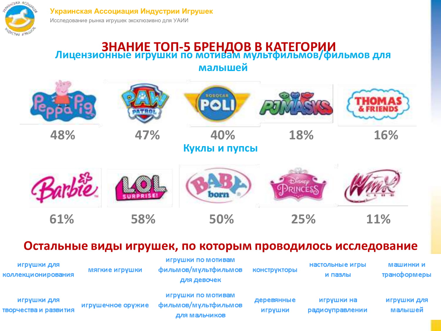 У топ-5 брендів в категорії ліцензійних іграшок за мотивами мультфільмів або фільмів для дітей входять такі бренди, як Barbie, Peppa Pig, Paw Patrol, LOL Surprise!, Baby Born і Robocar POLI. Продовжують утримуватися серед лідерів Thomas & Friends, а також феї Winx.