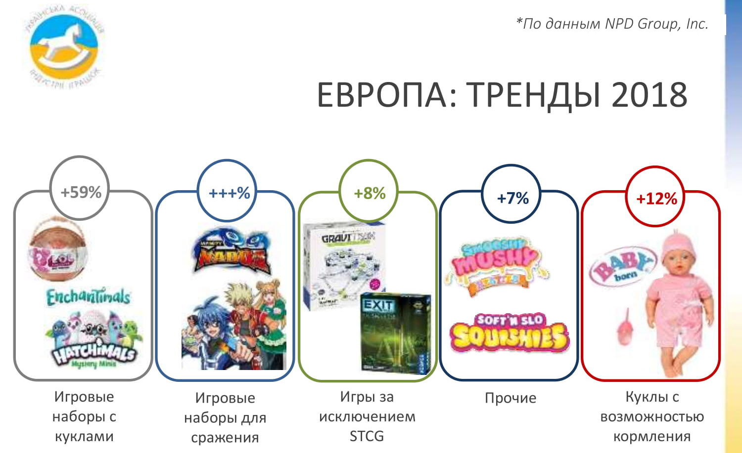 При цьому продажі іграшок на світовому ринку зросли за останній рік на 4%. За даними NDP Group в топ-10 світових брендів іграшок за кількістю продажів в січні-червні 2018 року увійшли L. O. L. Surprise!, Total Marvel, Star Wars, Nerf, Barbie, Hot Wheels та інші. Закриває десятку лідерів LEGO City. Схожі тенденції спостерігаються в Україні.