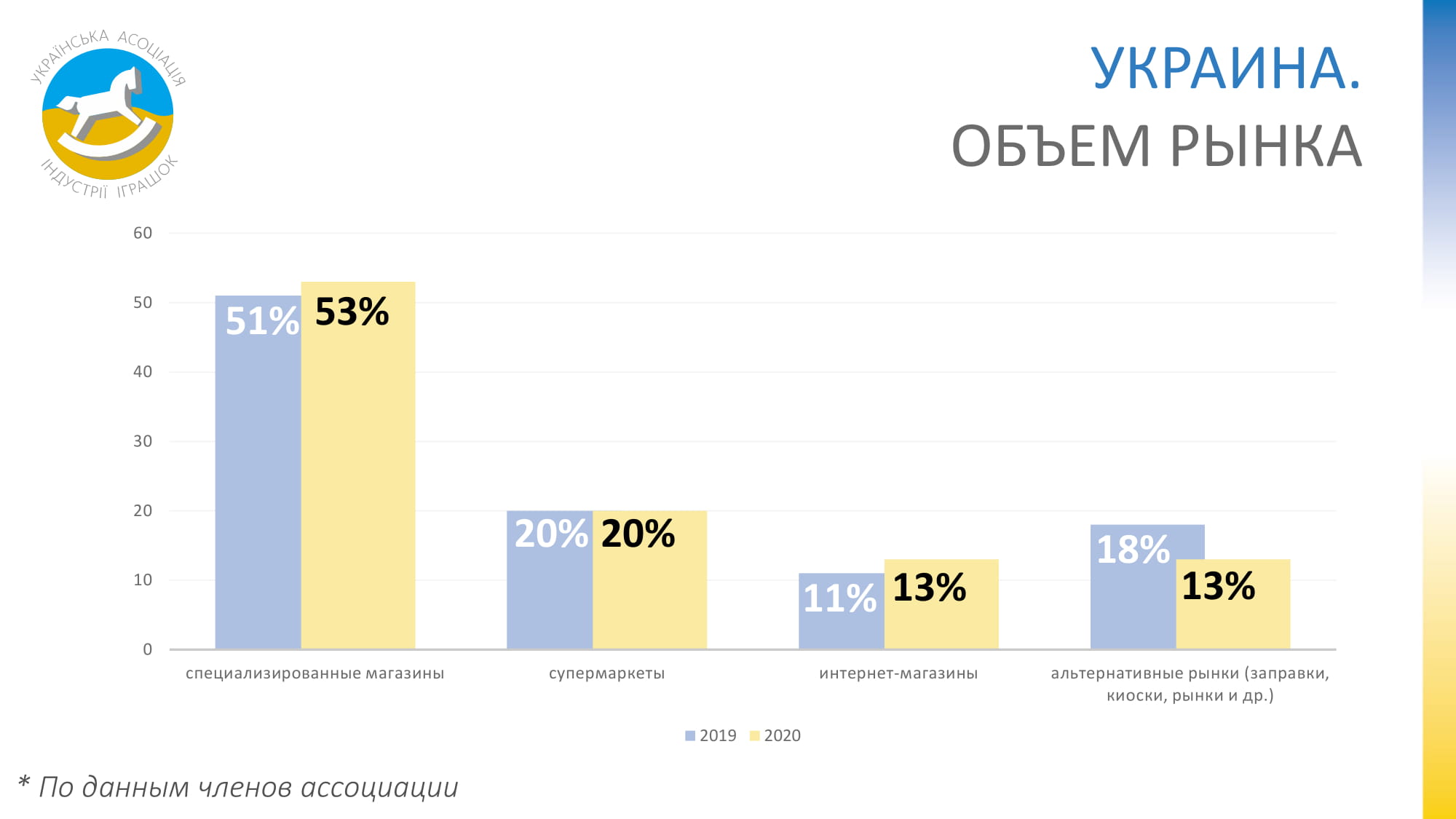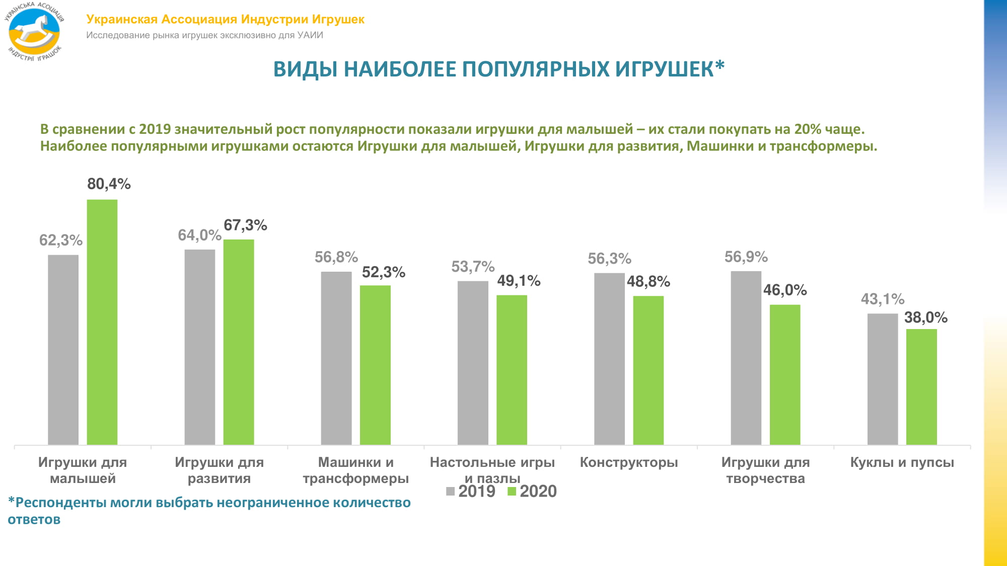Згідно з даними членів УАІІ, за минулий 2019 рік обсяг ринку іграшок України в роздрібних цінах збільшився на 18%, досягнувши $740 млн. Зростання тривало всі останні три роки. Про поточний 2020-й все ще важко що-небудь прогнозувати, падіння може варіюватися в межах 10-25%.