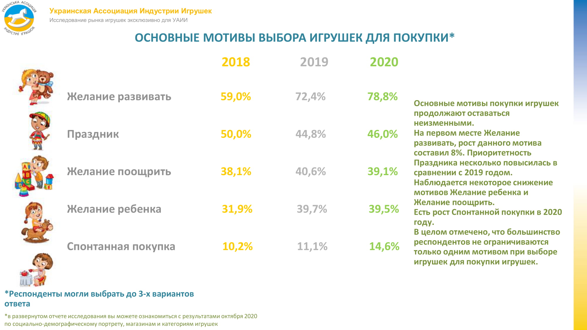 Основним мотивом покупки залишається бажання розвивати дитину, зростання цього стимулу склало 6,4%. Трохи підвищилася пріоритетність свята в порівнянні з 2019 роком. Спостерігається деяке зниження мотивів “бажання дитини” і “бажання заохотити”. Втім, більшість респондентів не обмежуються тільки одним мотивом при виборі іграшок для їх покупки.