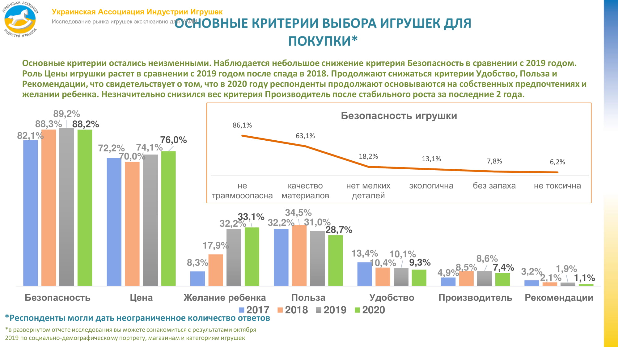 “Безпека іграшки” все ще відіграє ключову роль при виборі іграшки для покупки – її називають 88,2% респондентів. “Ціна” поступово наздоганяє цей критерій – її вважає ключовою для себе 76% опитаних. Продовжують знижуватися критерії “зручність”, “користь” і “рекомендації”, що свідчить про те, що в 2020 році респонденти продовжують гспиратися на власних уподобаннях і бажанні дитини. Незначно знизилася вага критерію “виробник” після стабільного зростання за останні два роки.